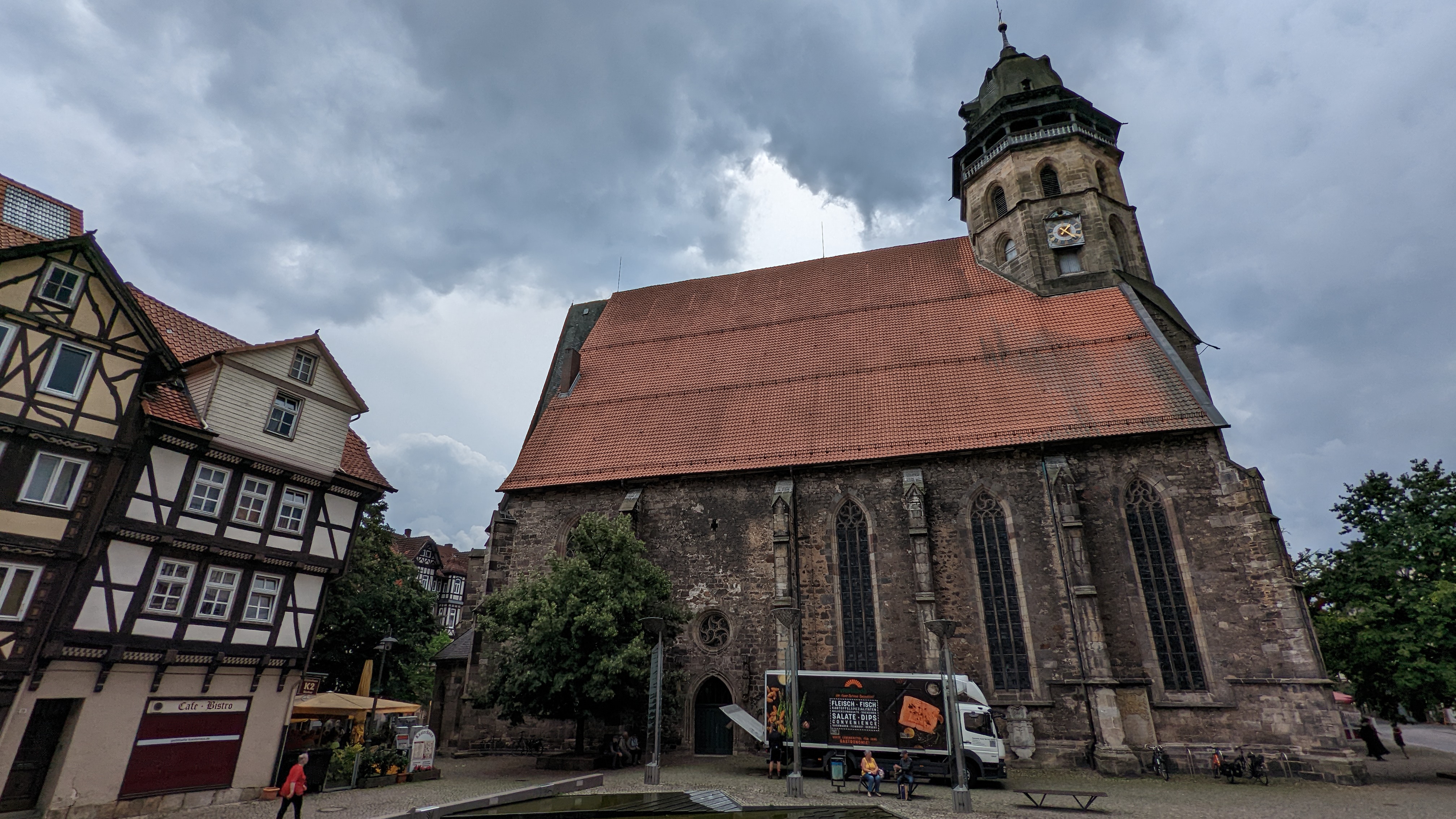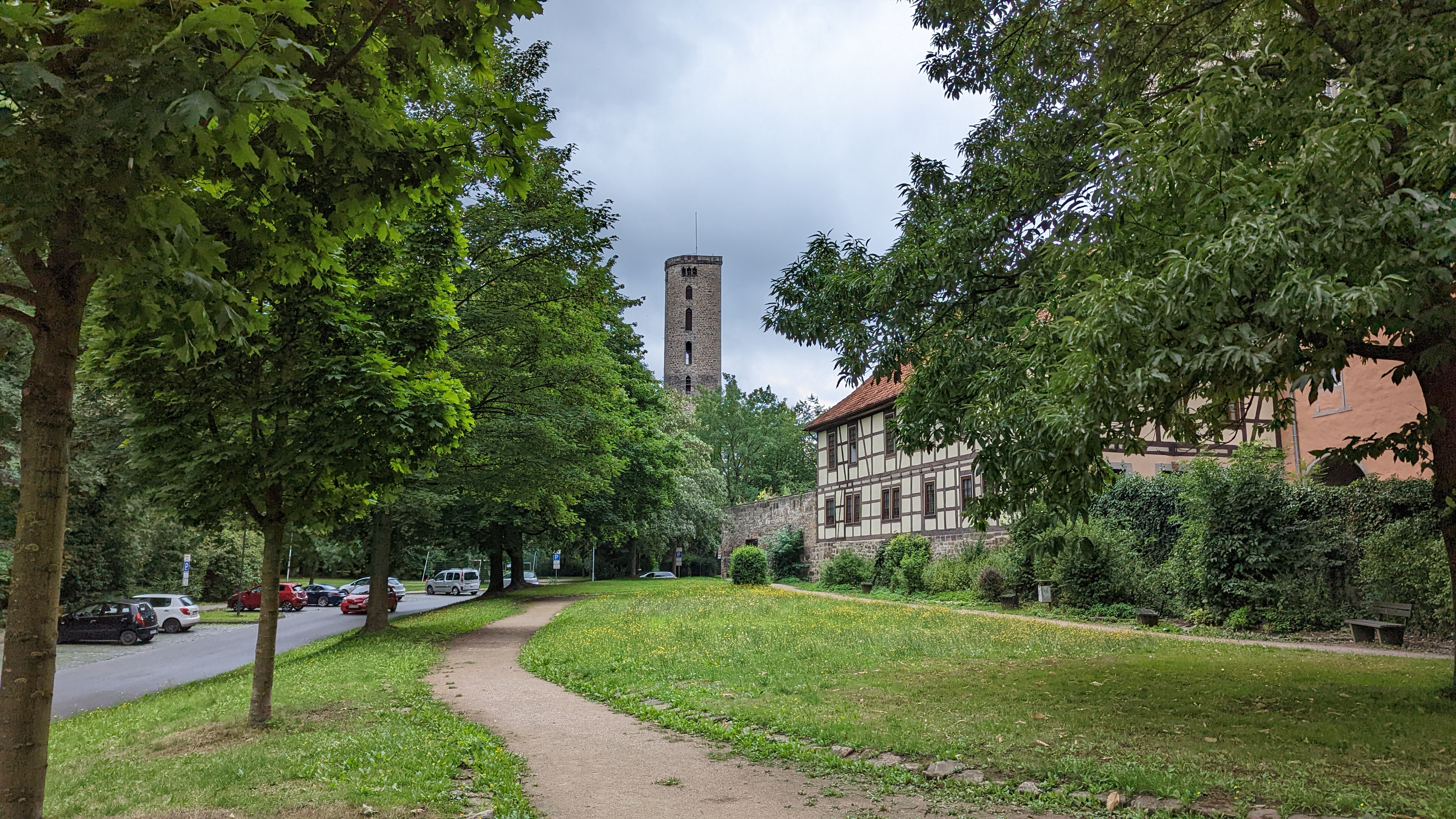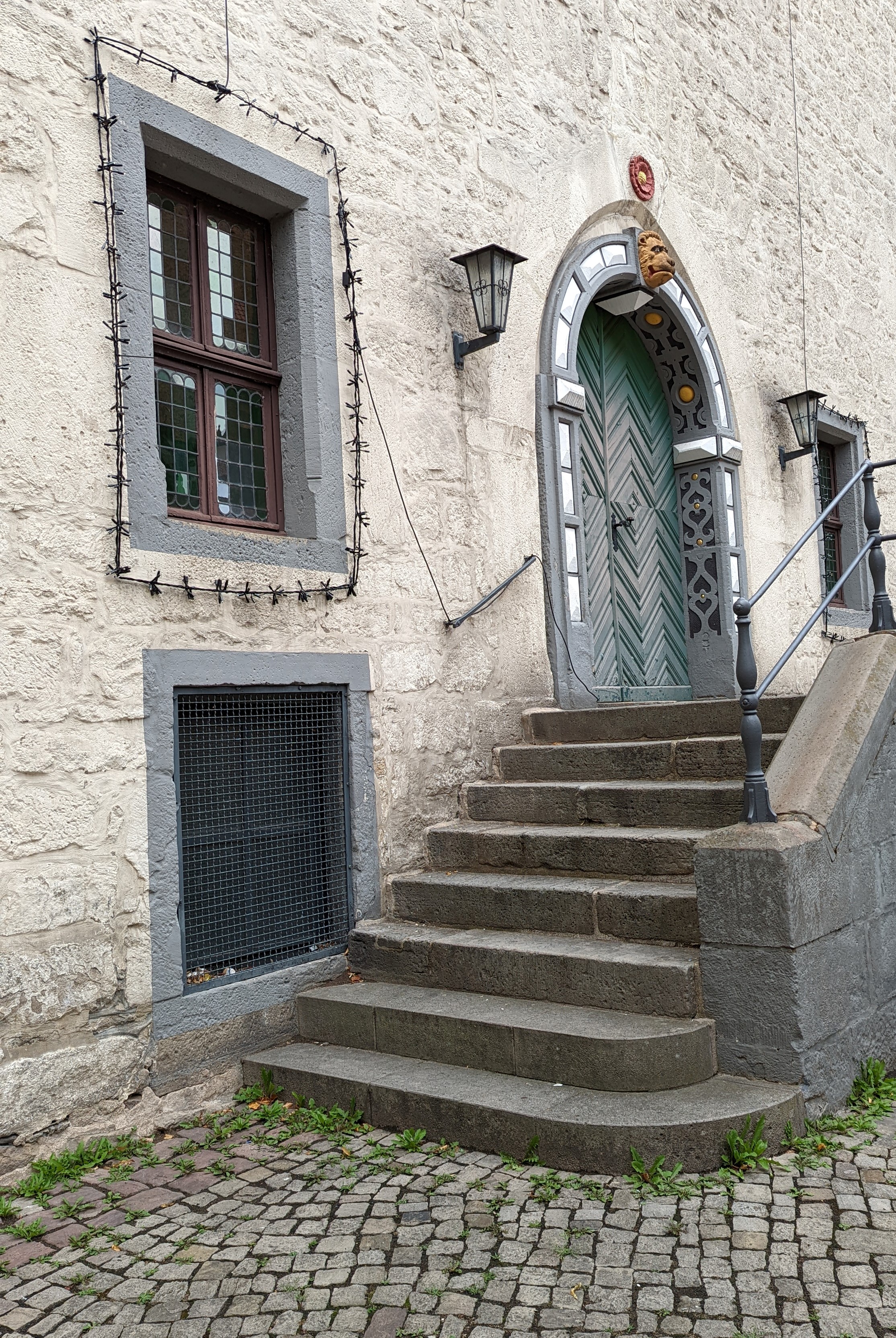 Noch einmal das Rathaus in Ganzem von der anderen Seite. Dann bin ich weiter marschiert zur alten Werrabrücke und was sehe ich da, den Doktor Eisenbart im Park in dem noch mehrere Skulpturen stehen sollen! Vorher bin ich aber noch an der Kirche St.Blasius vorbei marschiert und irgendeinem Haus an dem die Fenster alle mit Stacheldraht umgeben waren, hab leider nicht gefunden was das ist!