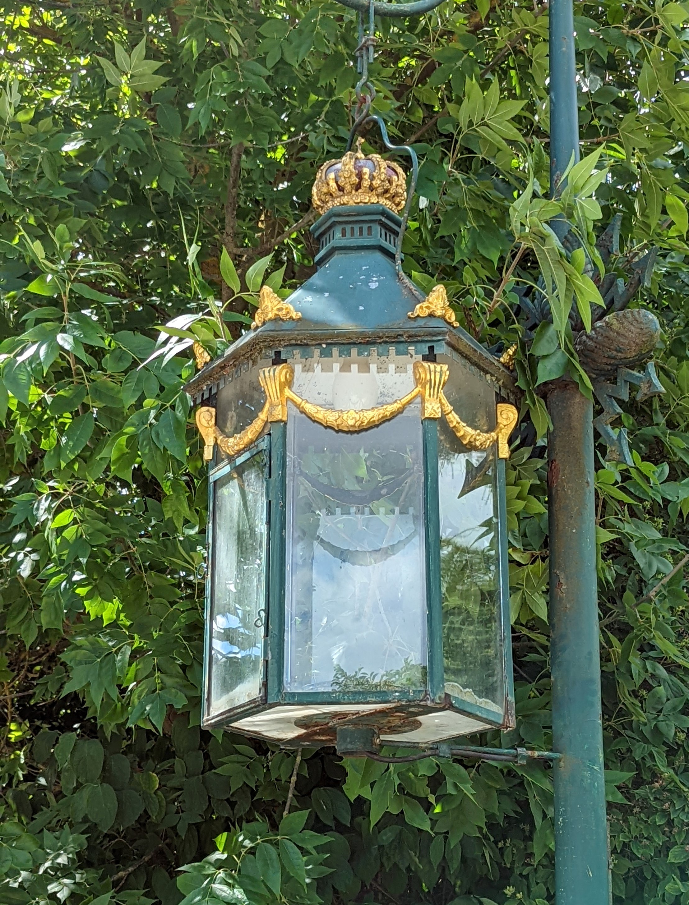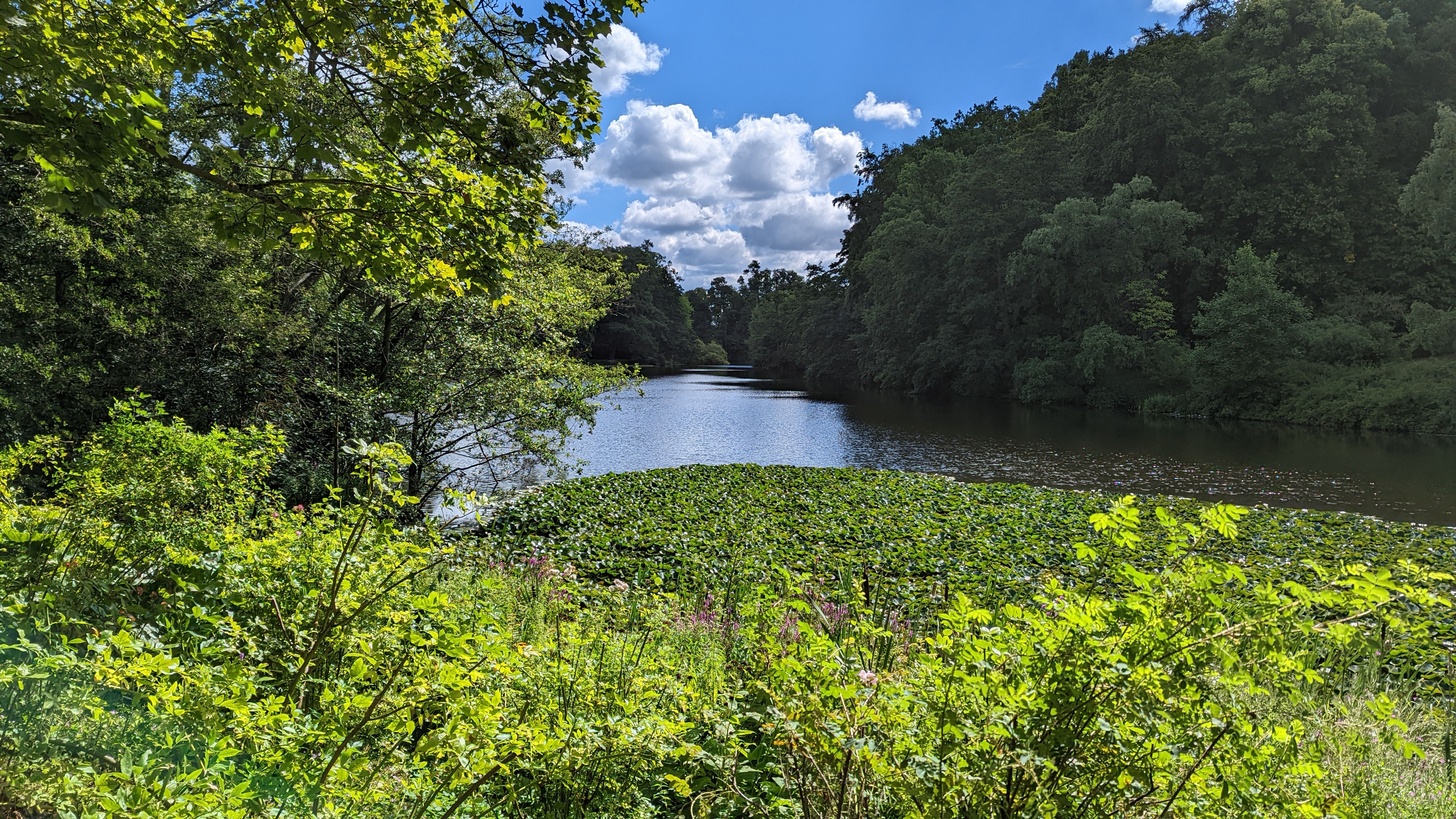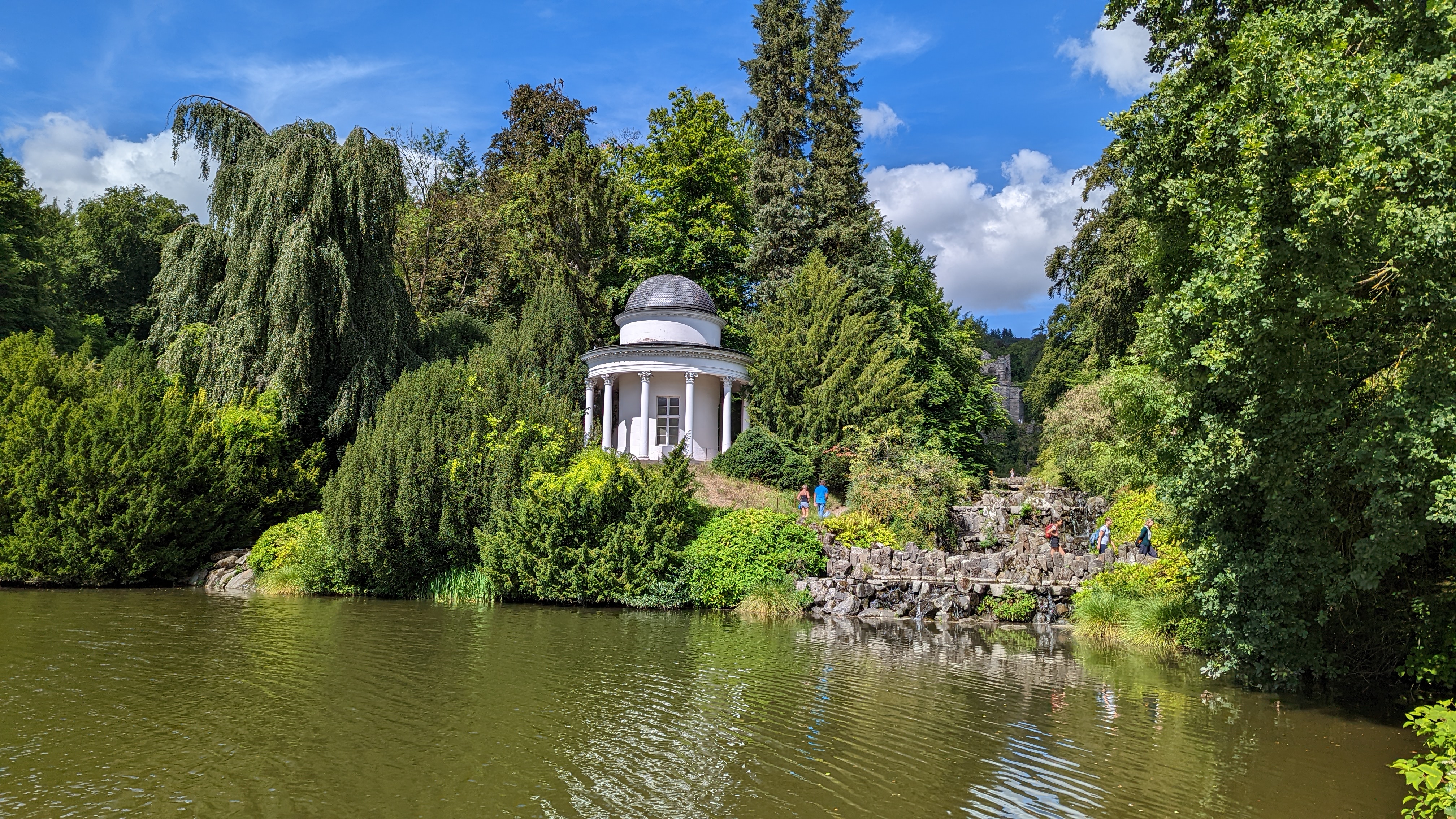 Viel Wasser gab es und auch Rosenstöcke, aber viel war da nicht mehr zu sehen, denen war es zu heiß! Und dann gab es einen See, an dem ein Landesfürst seinen Dackel begraben und ihm auch einen Stein gewidmet hat. Den See habe ich fotografiert, der Grabstein vom Dackel war zu weit weg! :roll: