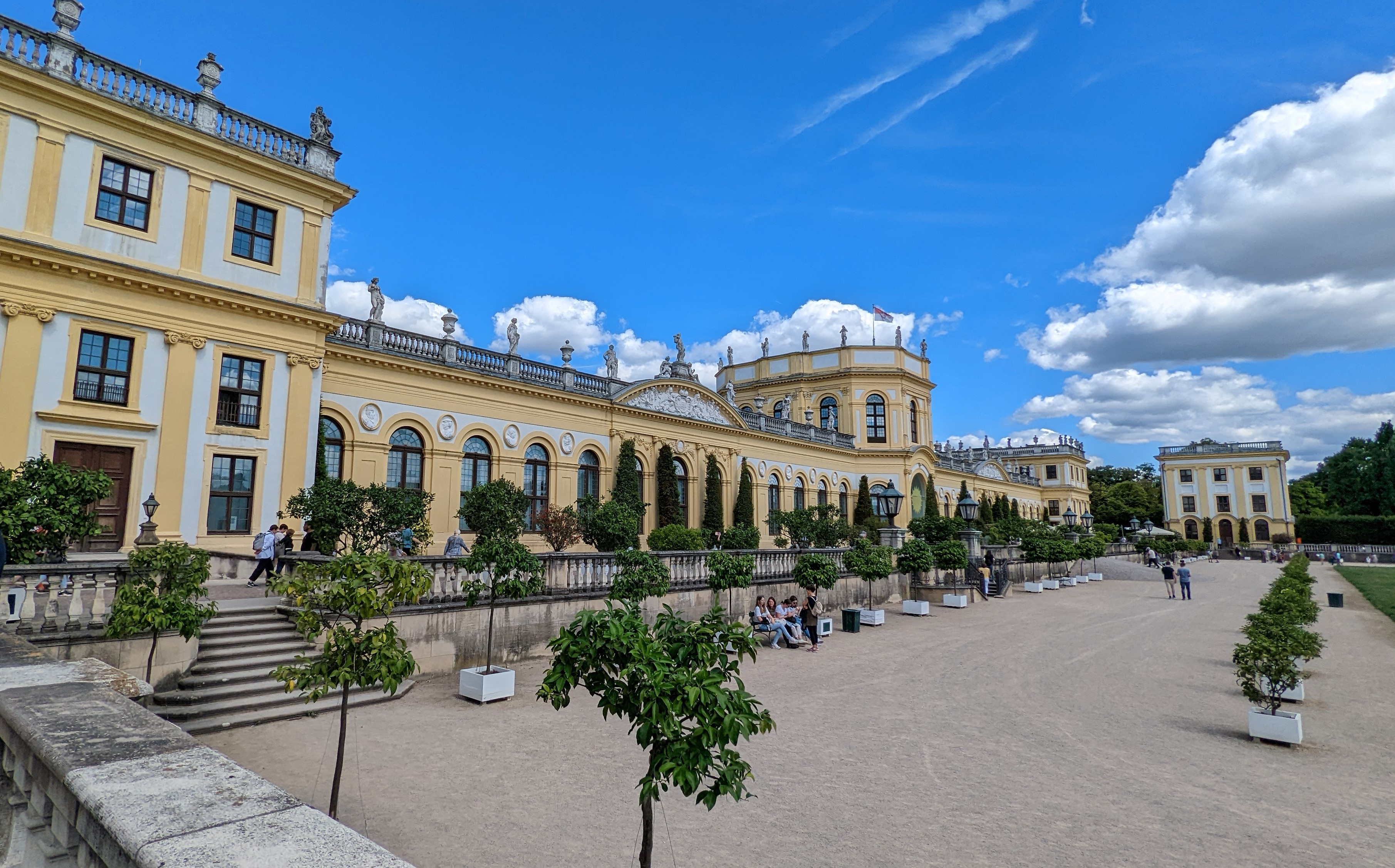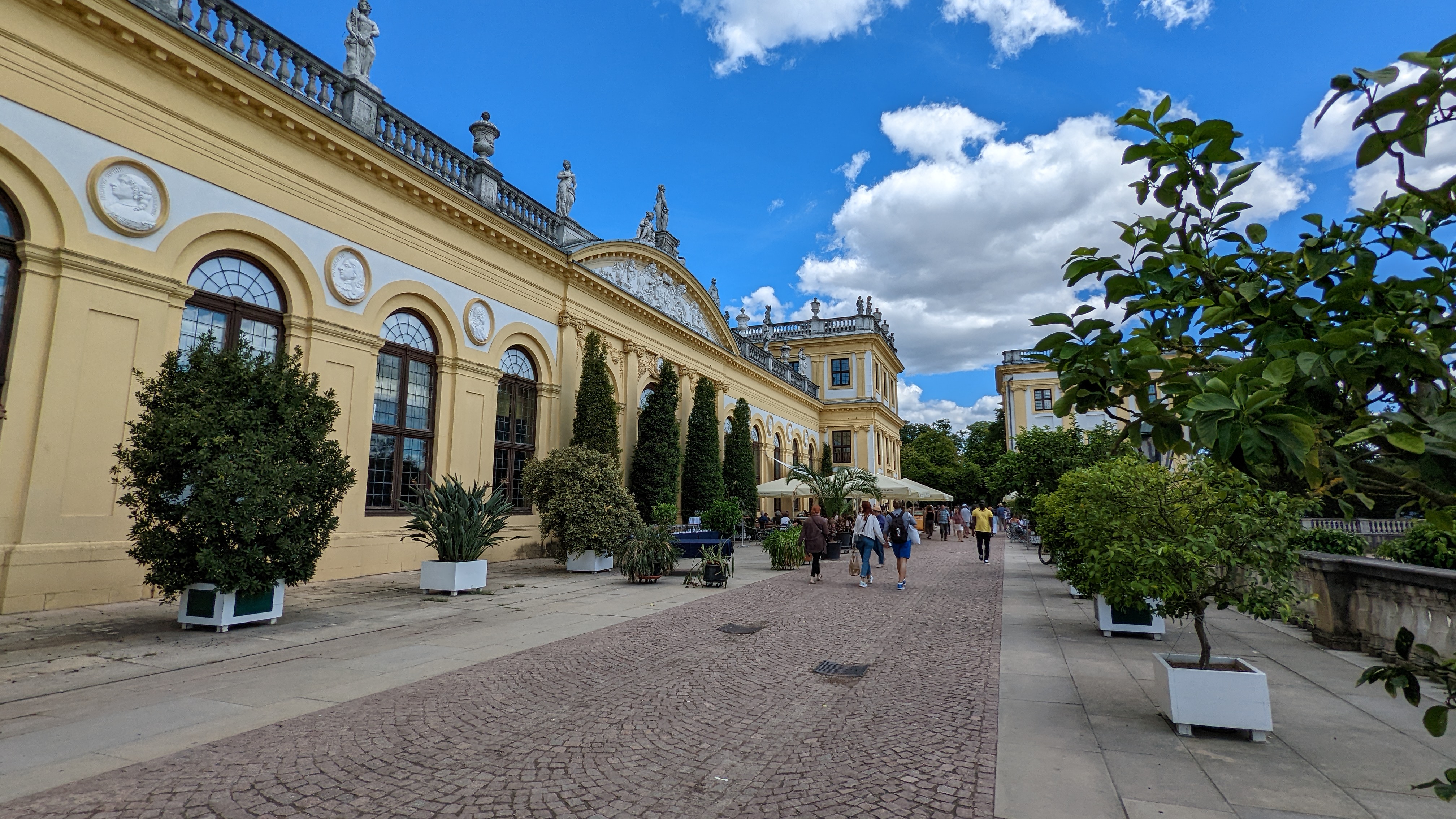 Bleibt uns nur noch die Orangerie. Die gibt es überall wo nicht winterharte Pflanzen wie Zitrusbäume untergebracht werden müssen, wie auch in Sanssouci in Potsdam.