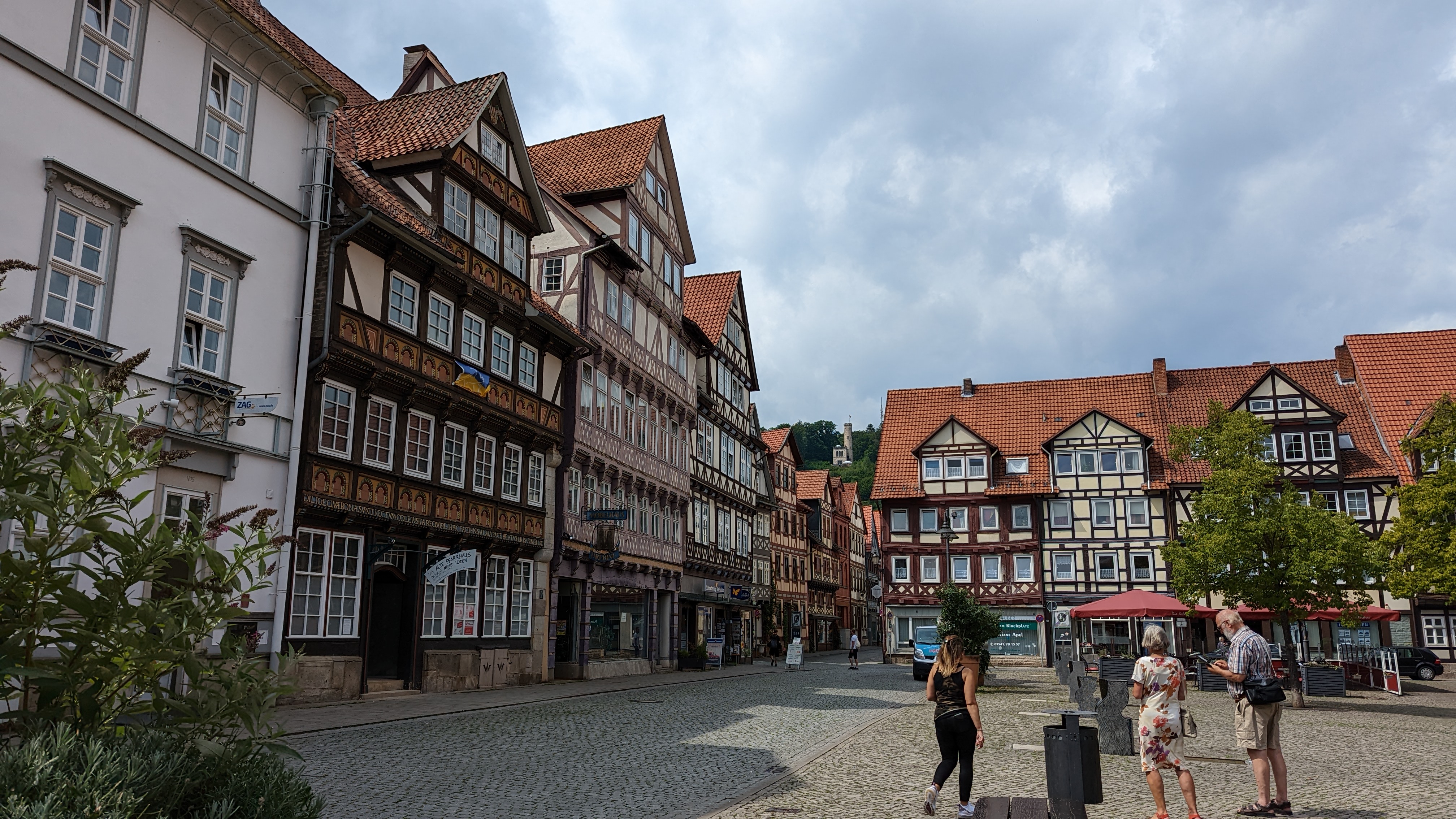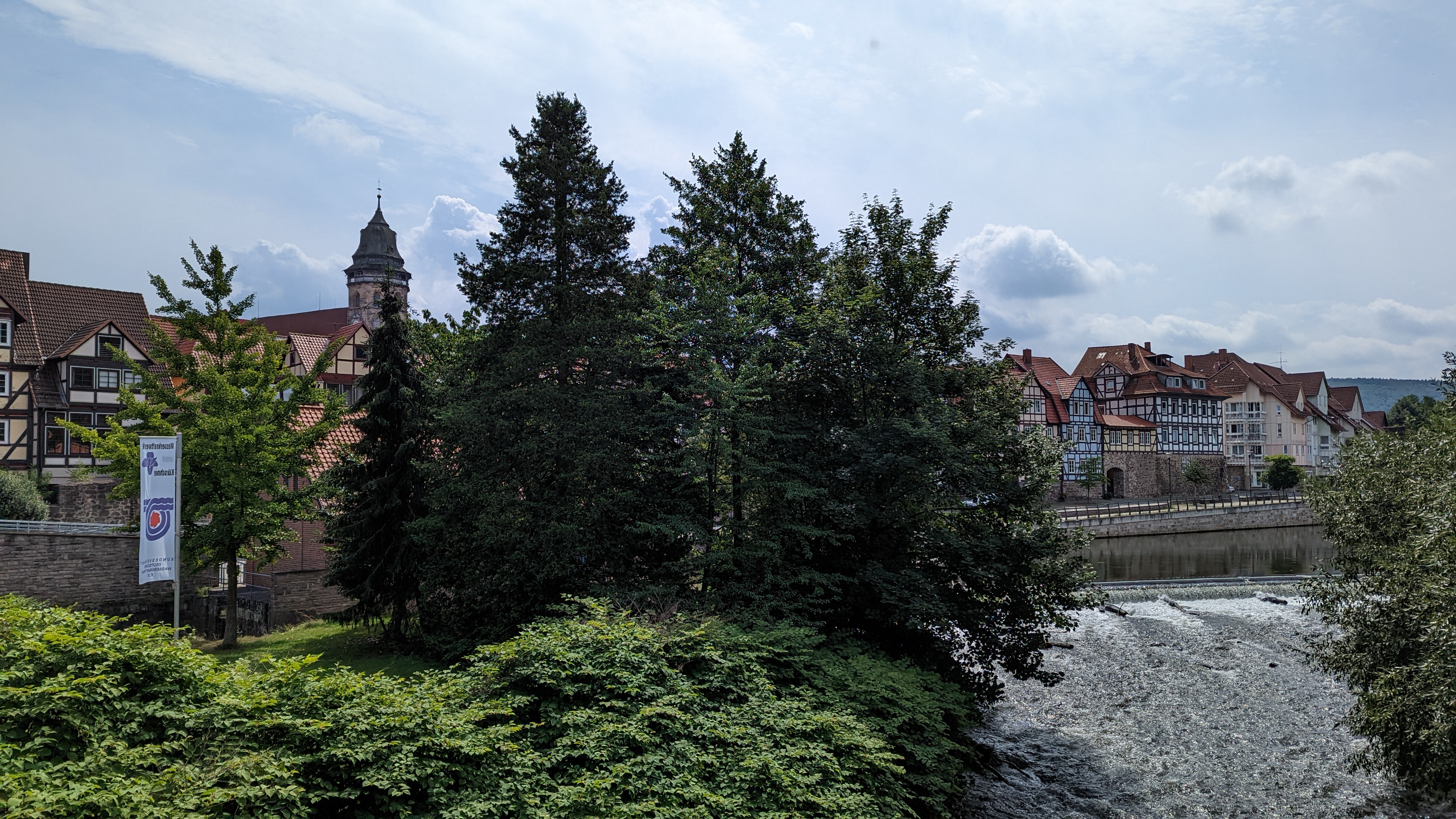 Weiter ging die Fahrt Richtung Hann. Münden durch den Reinhardswald. Wir befanden uns mal in Hessen, mal in Niedersachsen. Der Ort selber befindet sich an dem Zusammenfluss der Werra und der Fulda zur Weser. Ich war da schon mal vor 50 Jahren und kann mich kaum erinnern. Jedenfalls ist Hann. Münden voll mit Fachwerkhäusern, tollen Haustüren und lebt vom Fremdenverkehr. Mir hat es gut gefallen, es gibt wohl viele Gaststätten, aber zum essen hat ich keine Zeit! :roll: