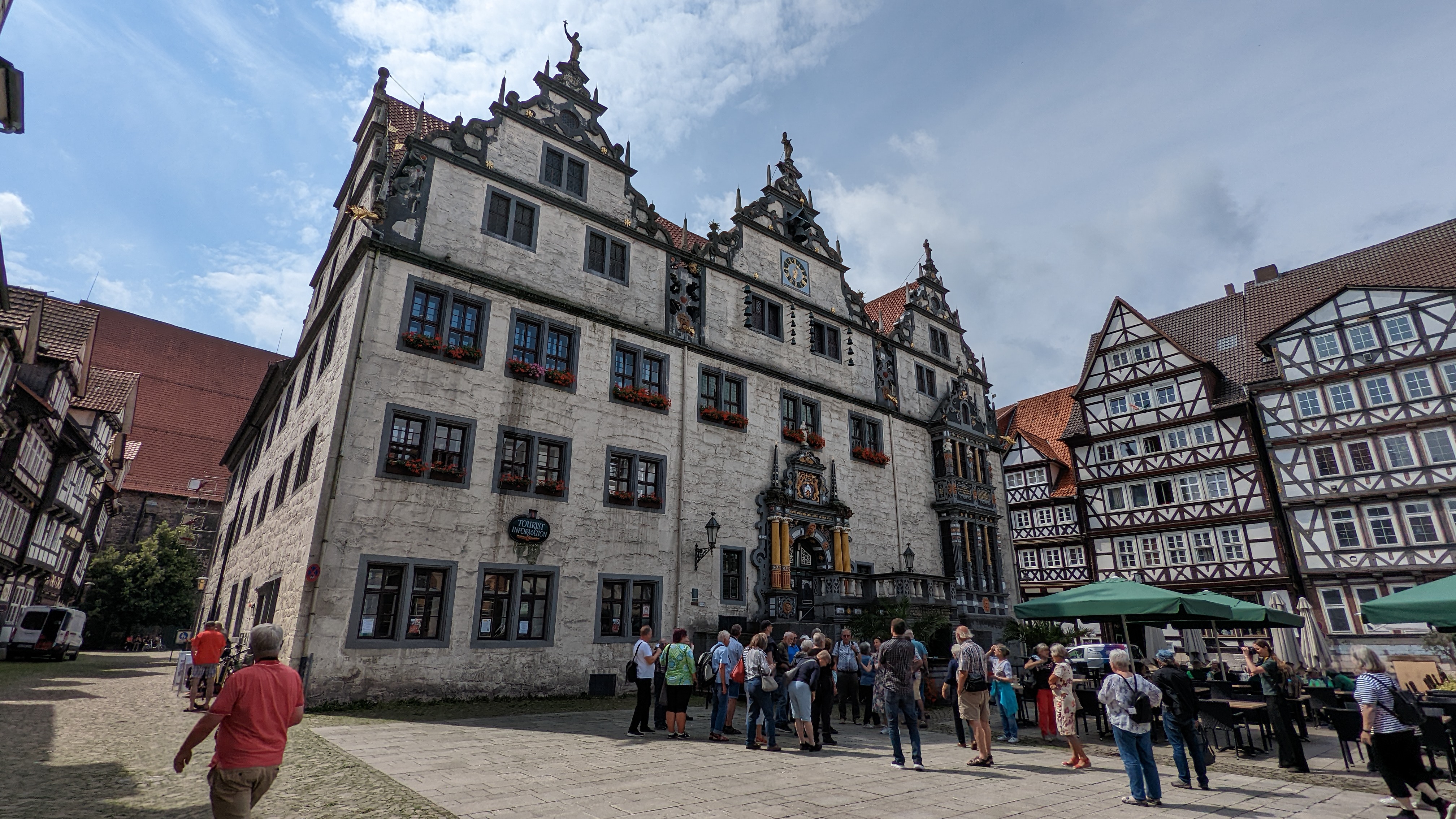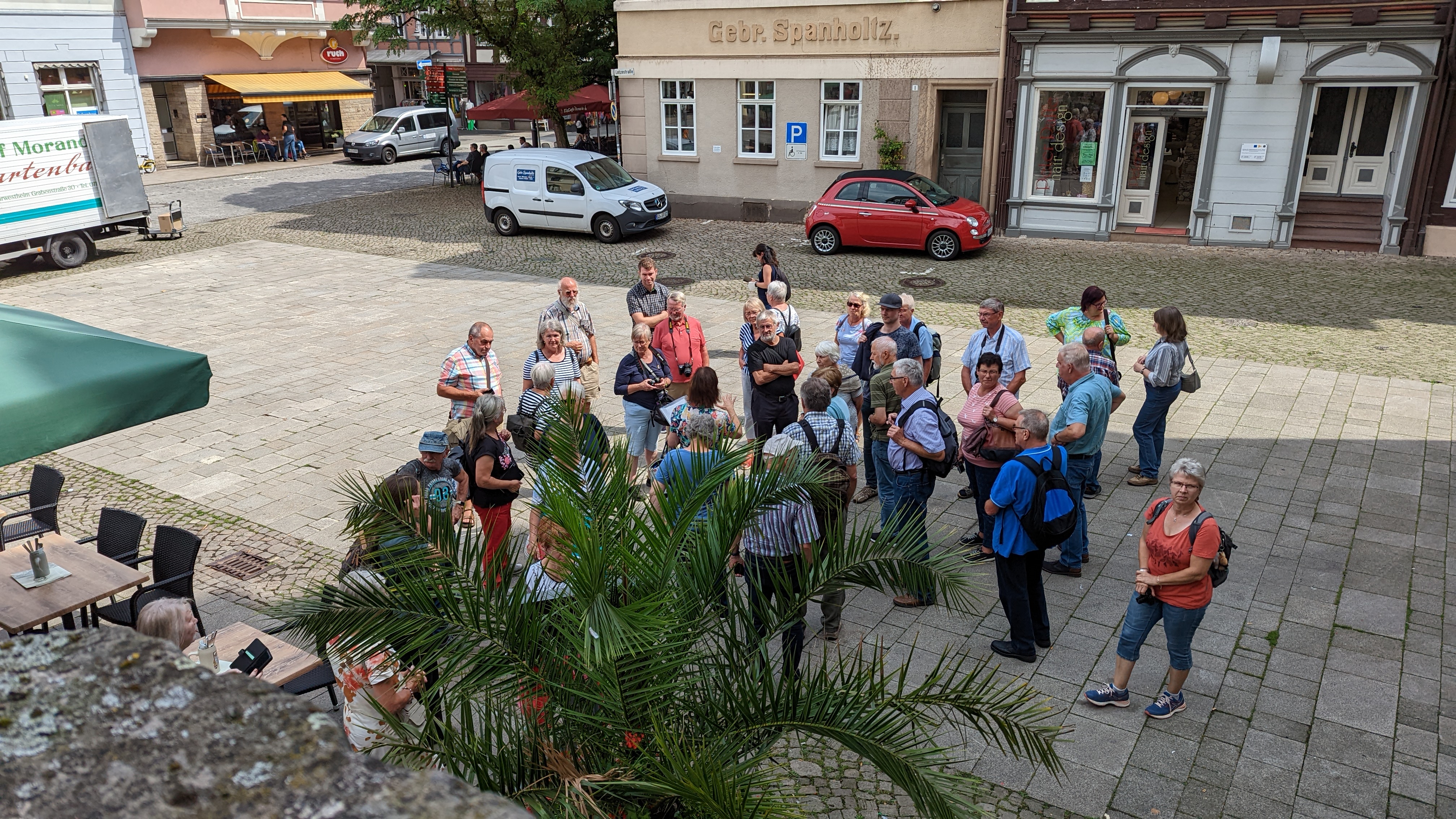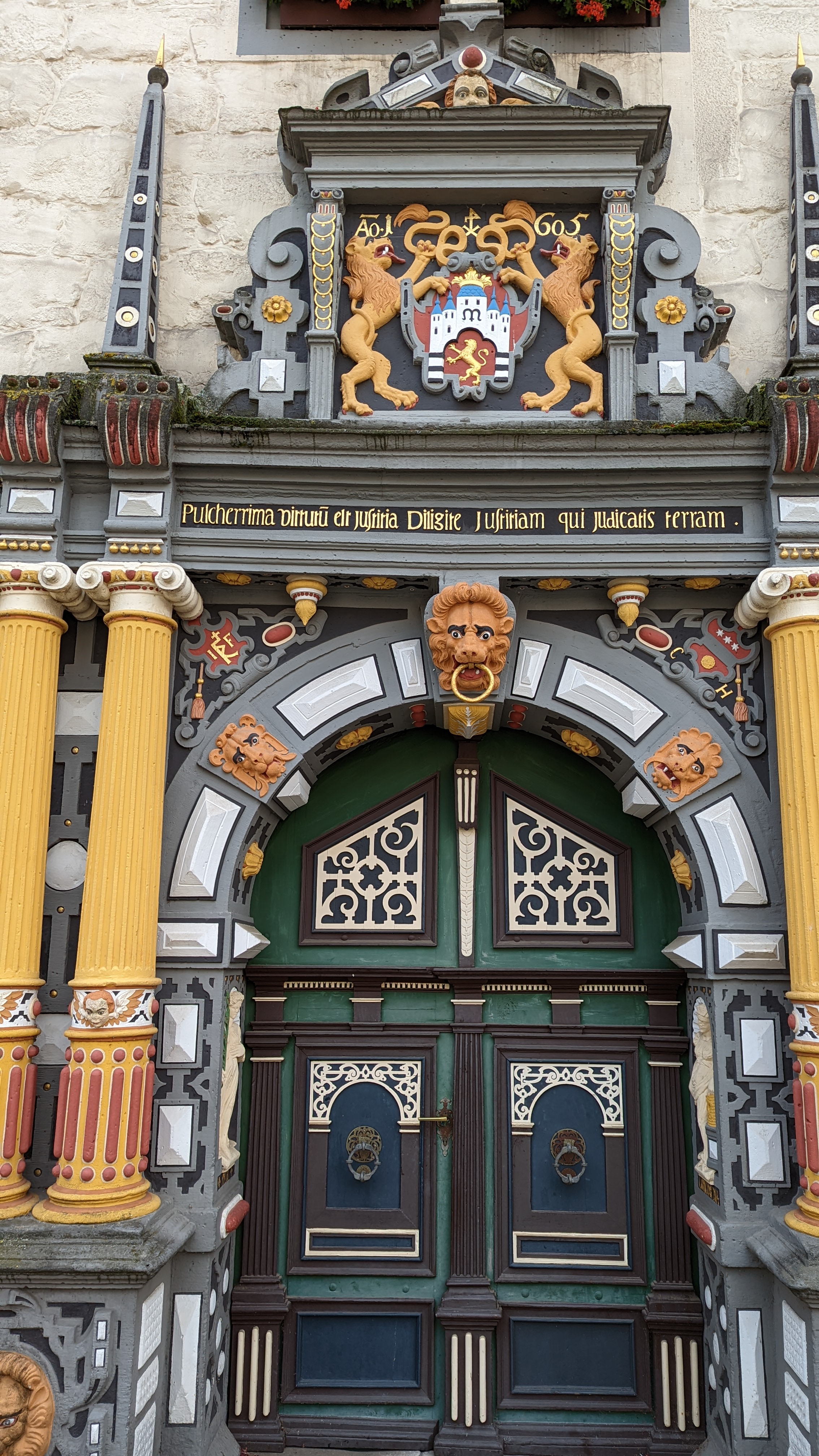 An den wunderschönen Haustüren konnte ich nicht immer vorbei gehen. Und schon standen wir vor dem Rathaus. Während alle dem Vortrag der Führerin folgten, machte ich als erstes Fotos vom Rathaus, von de n schönen Fachwerkhäusern in der Straße daneben, von der bombastischen Eingangstür und von oben die brave Truppe, die dem Vortrag aufmerksam lauschte! :lol: