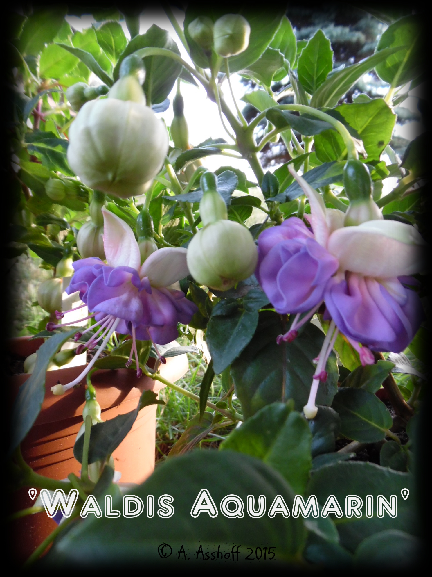 Für mich sieht diese Fuchsie aus wie die 'Blautopf'- ebenfalls von Frau Dietrich. Eine Fuchsie mit einem wunderschönen Blau. Sie sieht genau aus wie diese 'Waldis Aquamarin' - oder irre ich mich da? Übrigens: 'Blautopf' blüht gerade bei uns.