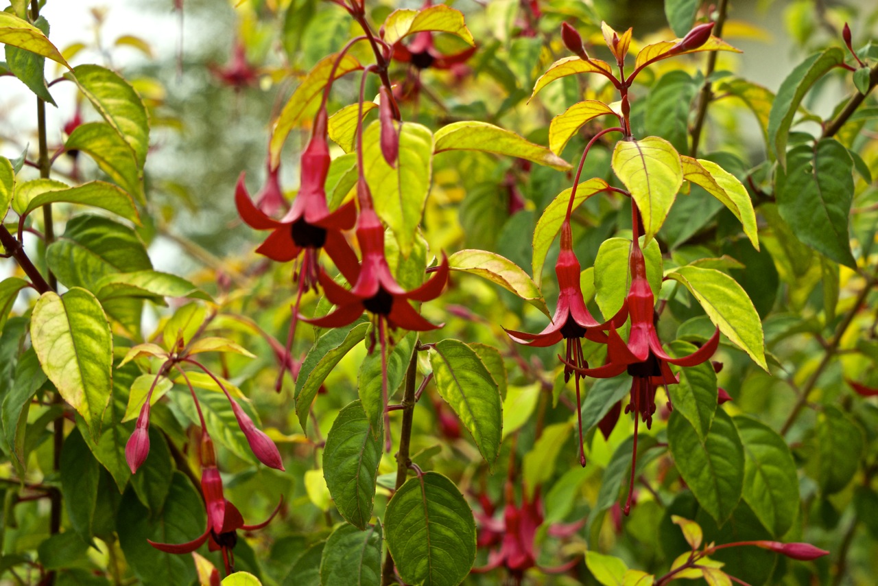 Und ich freue mich oft nicht nur über die vielen Blüten, sondern auch über die völlig unterschiedlichen Blätter- und das gleichzeitig- von fast sonnenverbrannt über gelb, orange, hell- bis dunkelgrün. Diese Fuchsie kann ich wirklich nur empfehlen!