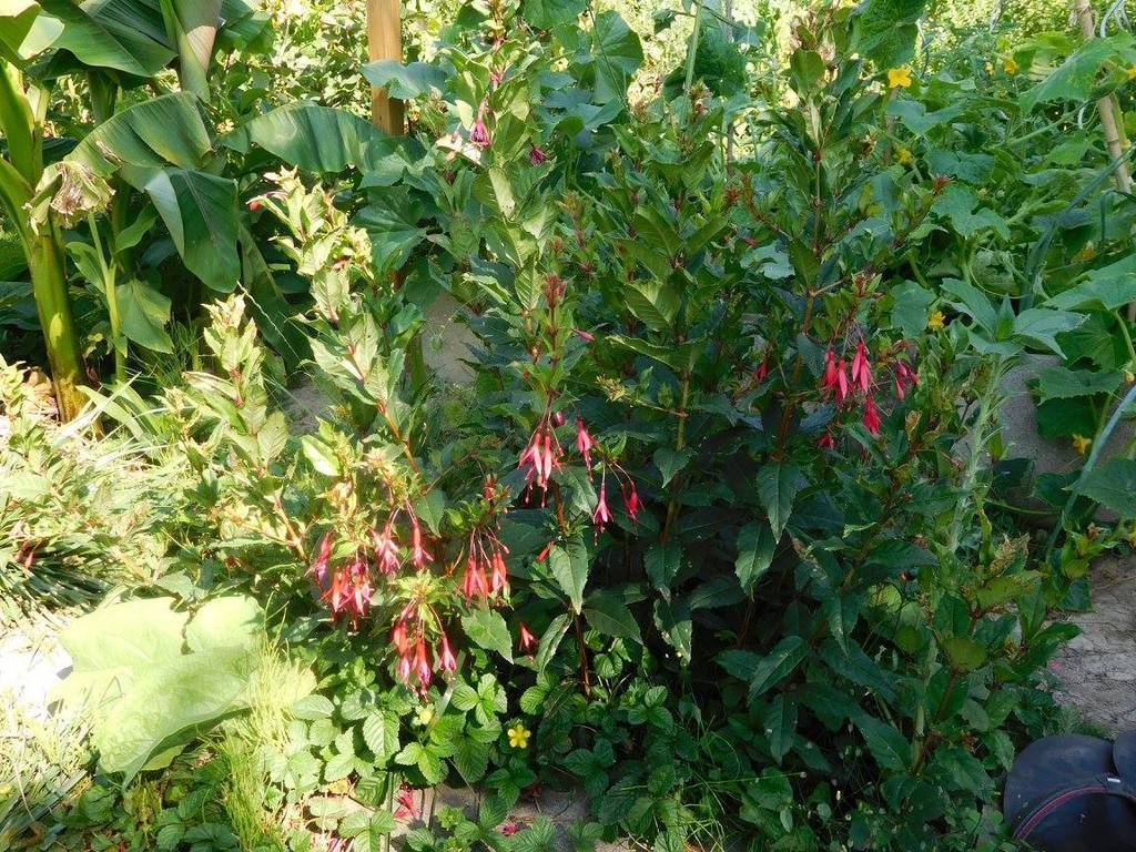 Und ja - neben der Fuchsie steht eine Musa basjoo im Garten, welche dieses Jahr zum ersten mal wohl so richtig hoch werden wird. Der Stamm kam durch einen Schutz mit Noppenfolie und Fliess ohne Schäden über den Winter - die wird dieses Jahr sicher ein gigantisches Gewächs