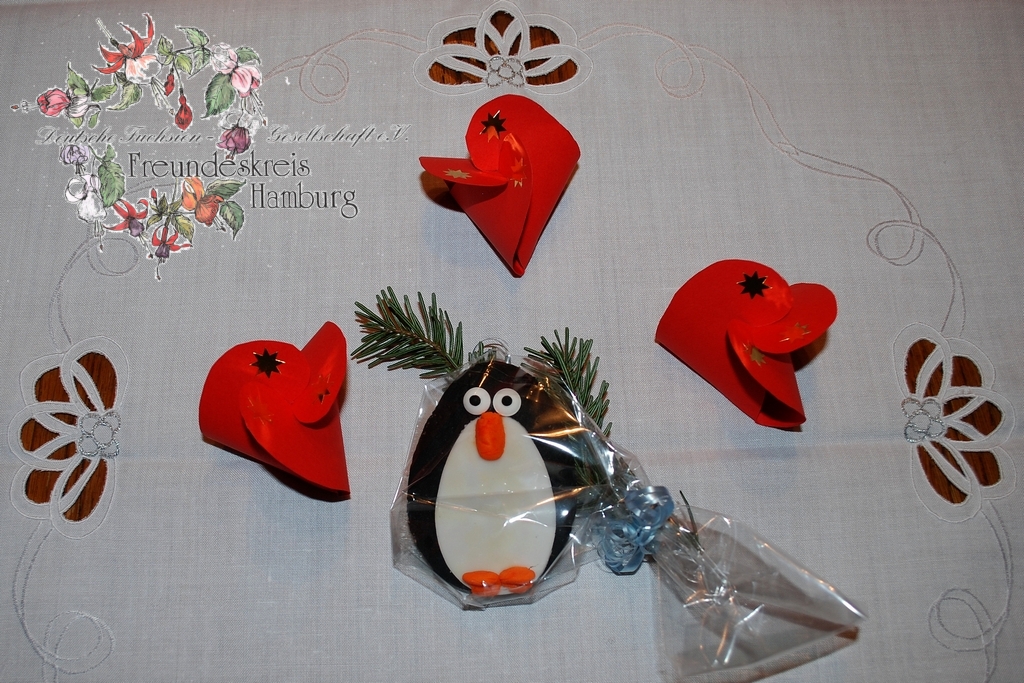 Und das waren die gebastelten Geschenke für die Mitglieder, Marzipan in roter Tüte (von Eva) und Pinguin-Keks von Barbara.