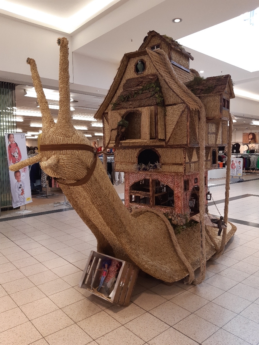 Gerade habe ich von Horst die Fotos aus dem Einkaufsmarkt bekommen. Die Schnecke wurde hier am Montag aufgestellt. Damit ihr eine Größenvorstellung bekommt. Sie sollte wohl noch höher werden, aber die Strecke mit Bäumen setzte das Limit in der Höhe.