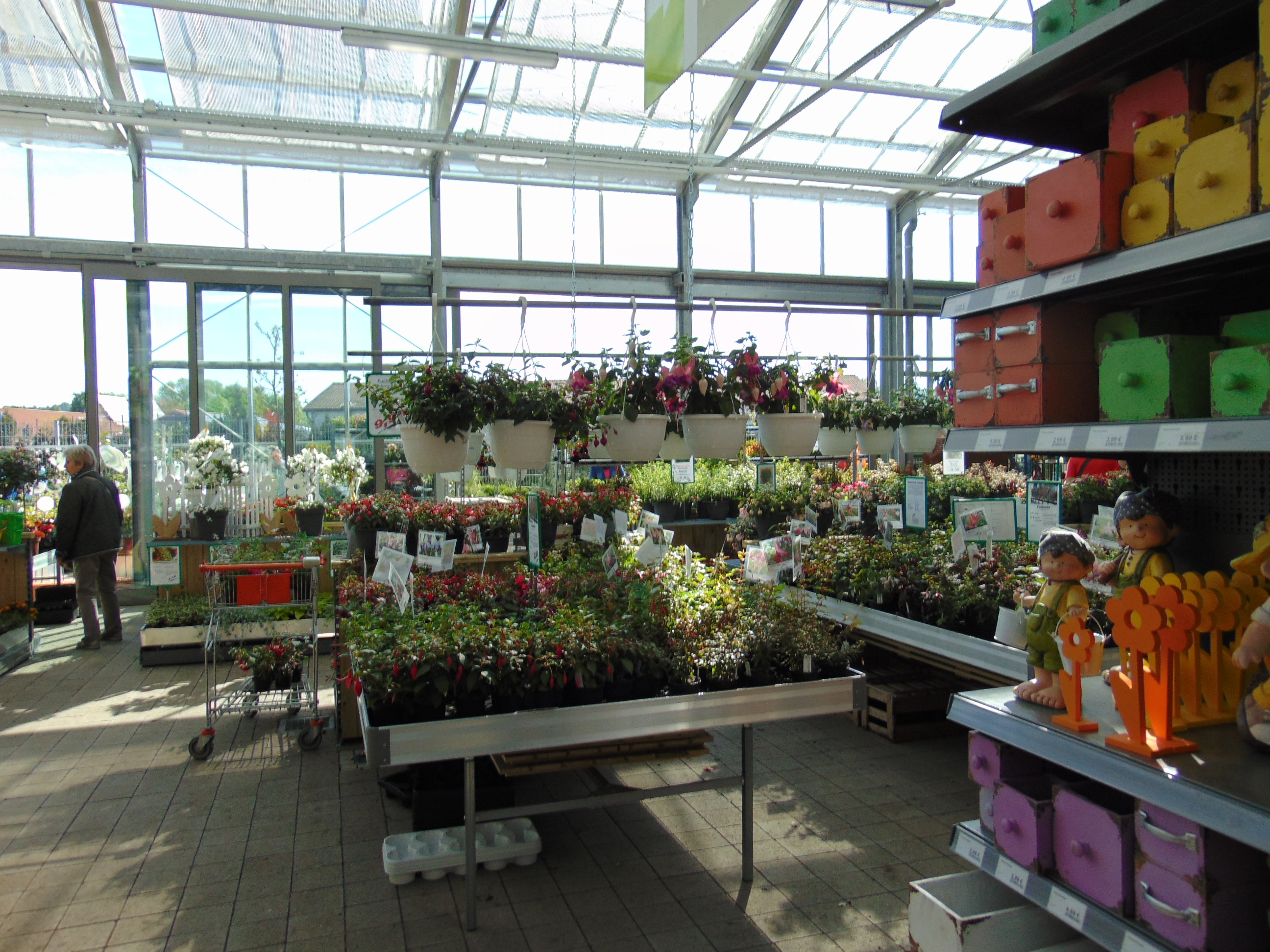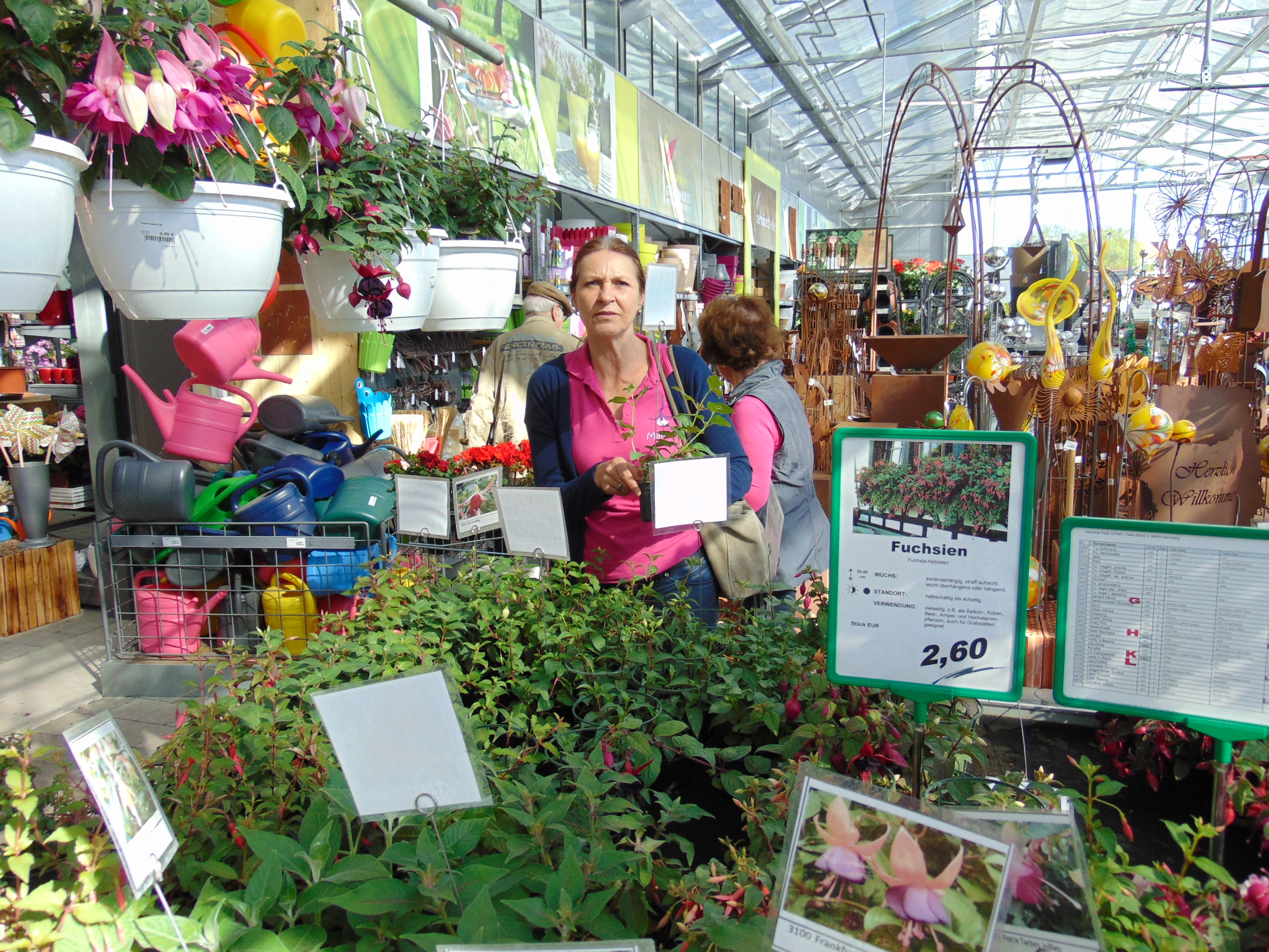 Im Geschäft bei Unflath. Die Preise waren sehr angenehm. Eine blühende Fuchsie im 10,5er Topf kostete 2,60€, Eine Ampel oder ein großer Topf 9,99€, ein normaler Hochstamm 14,99€ und dann verkauften sie einige ältere Hochstämmchen mit ca. 1,80m Höhe, ich nehme an alte Mutterpflanzen) für 30,00€ Linda beim Verstauen ihrer ''Beute''