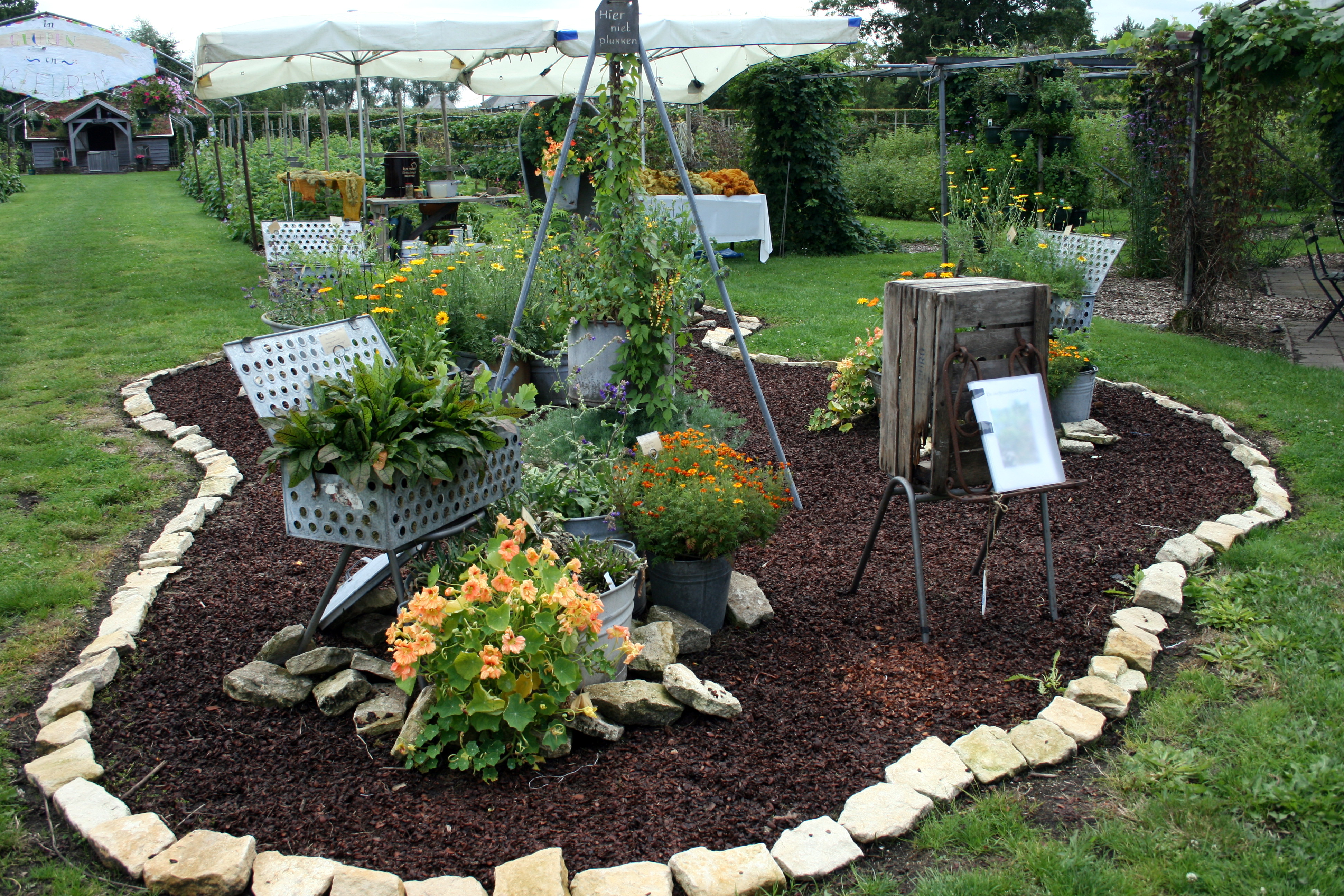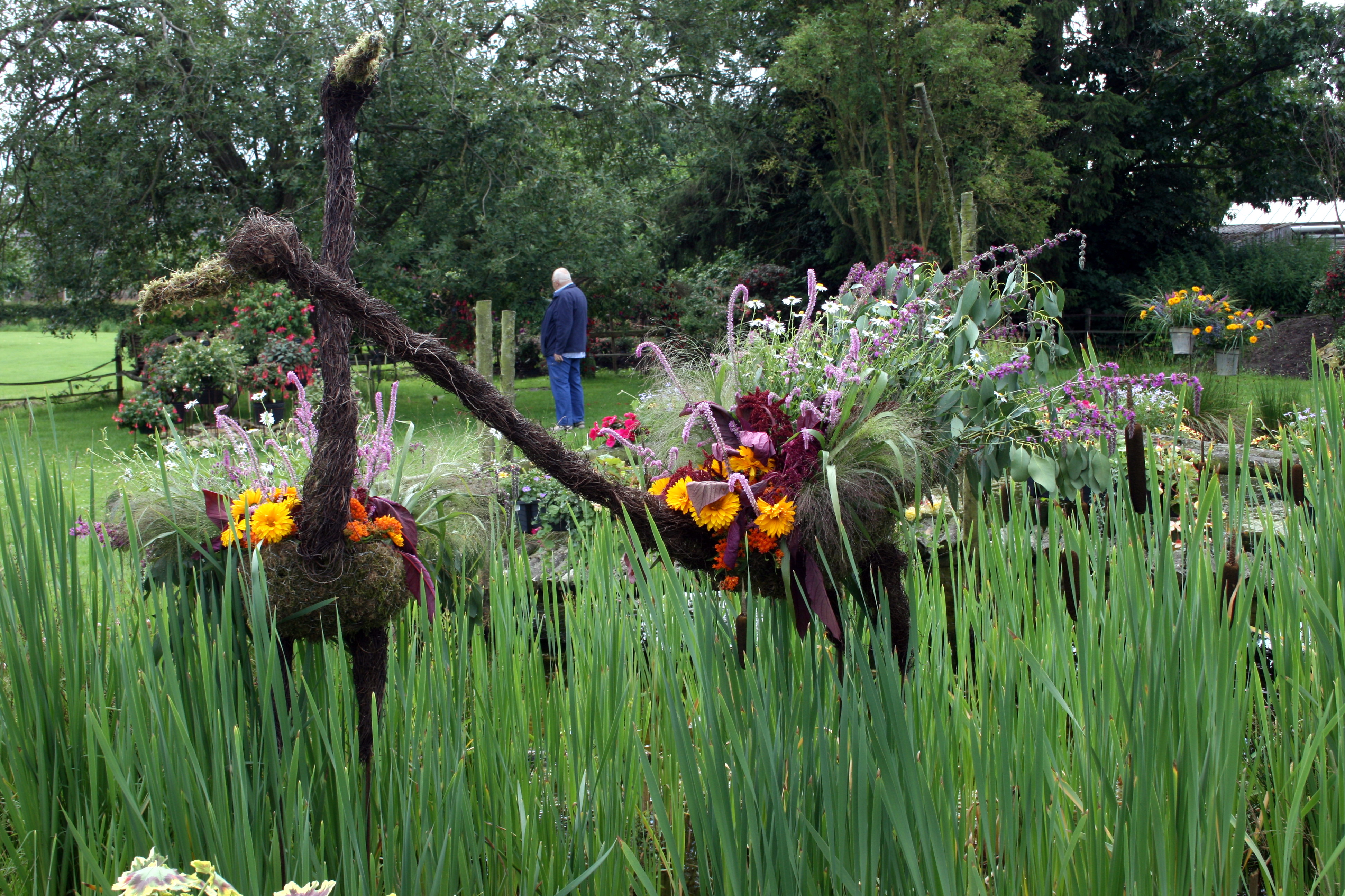 Und dann die Blumenausstellung. Prunkstück ist eine Meterhohe Pyramide, bestehend aus 100 Ampeltöpfen in verschiedensten Farben,-getreu dem Regenbogen. Ein aus Weidenzweigen gebogener U-förmiger Tunnelgang lud zum Schnuppern ein. Beim Durchgang konnte man an Duftgeranien die unterschiedlichsten Gerüche genießen-Limone, Zitrone, Melisse etc. An einem Stand wurde gezeigt, wie Wolle mit Pflanzen gefärbt werden kann. Am Teich standen zwei übergroße Vogelstatuen aus Zweiggeflecht. Umsäumt wurde das Ganze von diversen Fuchsien Arrangements. Hier ein Feld mit winterharten Exemplaren, dort Triphylla und sonstige Sorten. Für einen Aha-effekt sorgten die sehr alten, teils über 50 Jahre alten Stämme, die teilweise noch aus dem Bestand der ehemaligen Fuchsiengärtnerei Speek stammen.