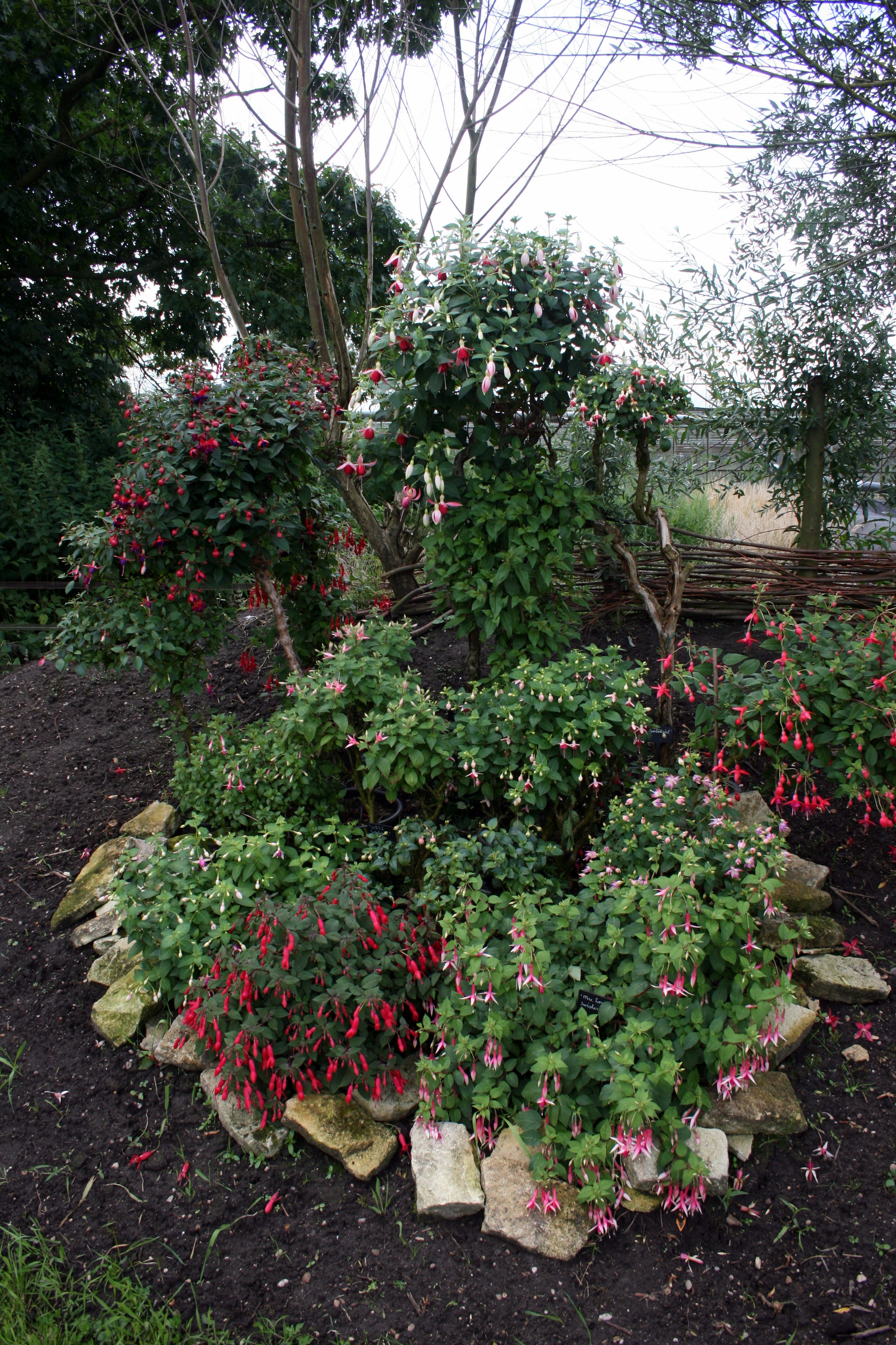 Und dann die Blumenausstellung. Prunkstück ist eine Meterhohe Pyramide, bestehend aus 100 Ampeltöpfen in verschiedensten Farben,-getreu dem Regenbogen. Ein aus Weidenzweigen gebogener U-förmiger Tunnelgang lud zum Schnuppern ein. Beim Durchgang konnte man an Duftgeranien die unterschiedlichsten Gerüche genießen-Limone, Zitrone, Melisse etc. An einem Stand wurde gezeigt, wie Wolle mit Pflanzen gefärbt werden kann. Am Teich standen zwei übergroße Vogelstatuen aus Zweiggeflecht. Umsäumt wurde das Ganze von diversen Fuchsien Arrangements. Hier ein Feld mit winterharten Exemplaren, dort Triphylla und sonstige Sorten. Für einen Aha-effekt sorgten die sehr alten, teils über 50 Jahre alten Stämme, die teilweise noch aus dem Bestand der ehemaligen Fuchsiengärtnerei Speek stammen.