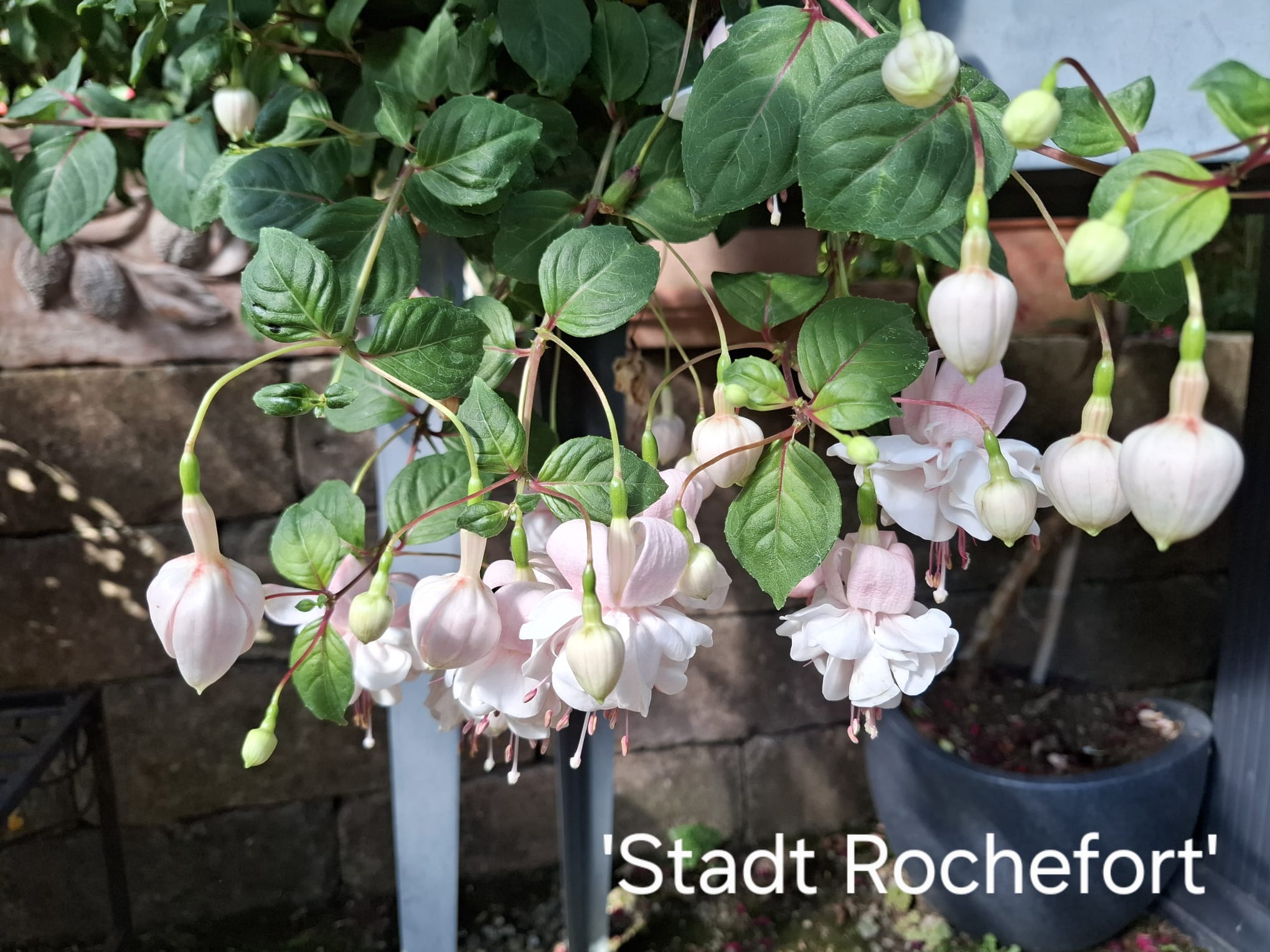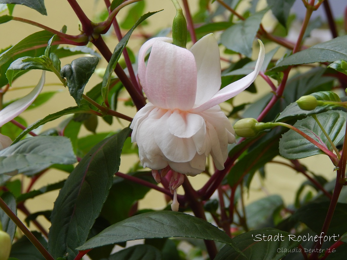 Die 'Stadt Rochefort' habe ich auch schon recht lange und ich gebe sie immer gern als Anfängerfuchsie weiter. Leider Gottes sind alle Neueinsteiger immer auf die großen, dicken gefüllten Sorten aus. Mit den "Normalos" wollen die meisten sich gar nicht erst abgeben. (Kommt dann später :D) Aber bei dieser Sorte brauch ich da keine Bedenken haben. Sie wächst gut,verzeiht auch mal einen Pflegefehler und blüht immer wieder aufs Neue. Die Blüten halten auch schön lange und werden nicht gleich braun im Regen. Ich guck mal, ob ich Fotos finde :)