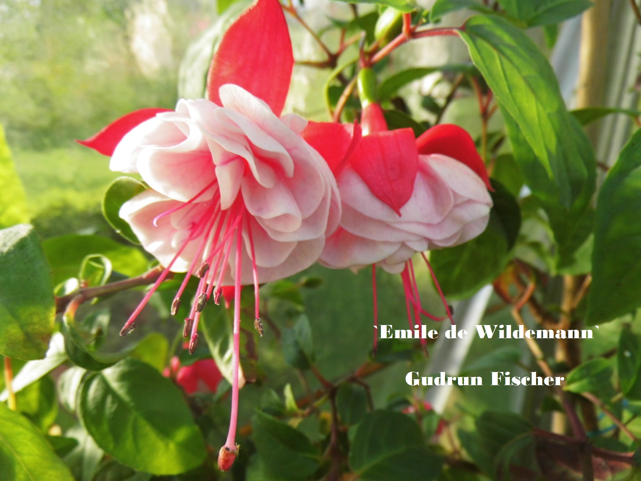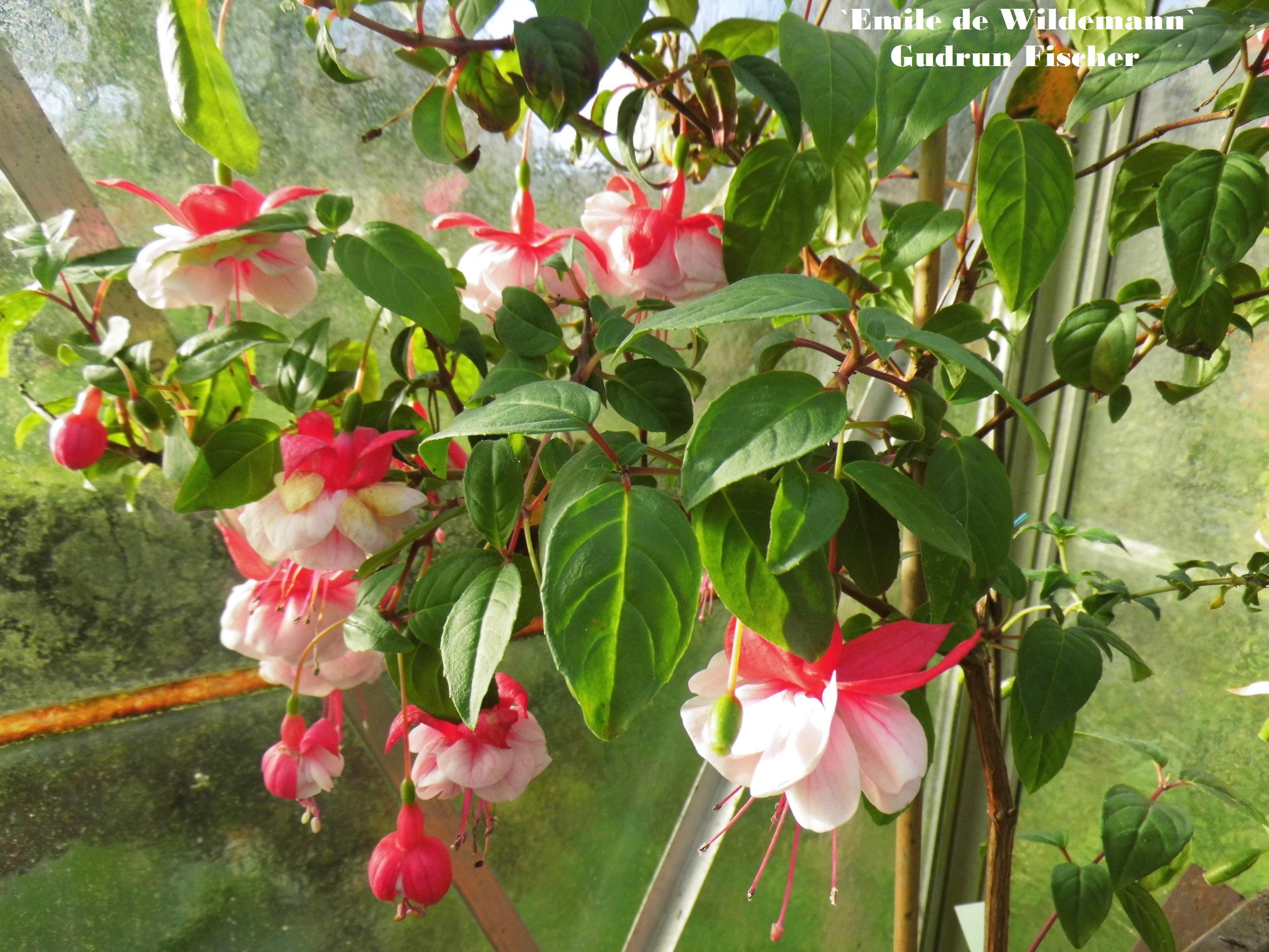 Beim Einräumen und Zurückschneiden der Fuchsien fällt einem doch immer wieder irgendeine besondere Sorte ins Auge. Ich möchte Euch heute `Emile de Wildemann`, eine Züchtung von Victor Lemoine aus dem Jahr 1905 zeigen. Sie ist wirklich besonders und erfreut mit ihren hellrot - rosaweiss gefüllten mittelgroßen Blüten . Die Pflanze wächst aufrecht und blüht die ganze Saison fast ohne Unterbrechung. Jetzt zum Saisonende legt sie nochmal richtig los und ist bedeckt mit Blütenbällen. Das Laub ist kräftig und scheint auch von Plagegeistern verschont zu sein. Sie steht bei mir, mit Beginn der herbstlichen Witterung ,im Gewächshaus und ist von Regen verschont geblieben, so dass auch die schönen Blüten voll zur Geltung kommen können. Ich habe sie jetzt das zweite Jahr, den Winter im Keller hat sie gut überstanden, da die Pflanze auch gut verholzt war. Stecklinge bewurzeln willig. Oft ist sie auch unter dem Namen `Fascination `zu finden. Es lohnt sich `Emile de Wildemann `zu kultivieren.