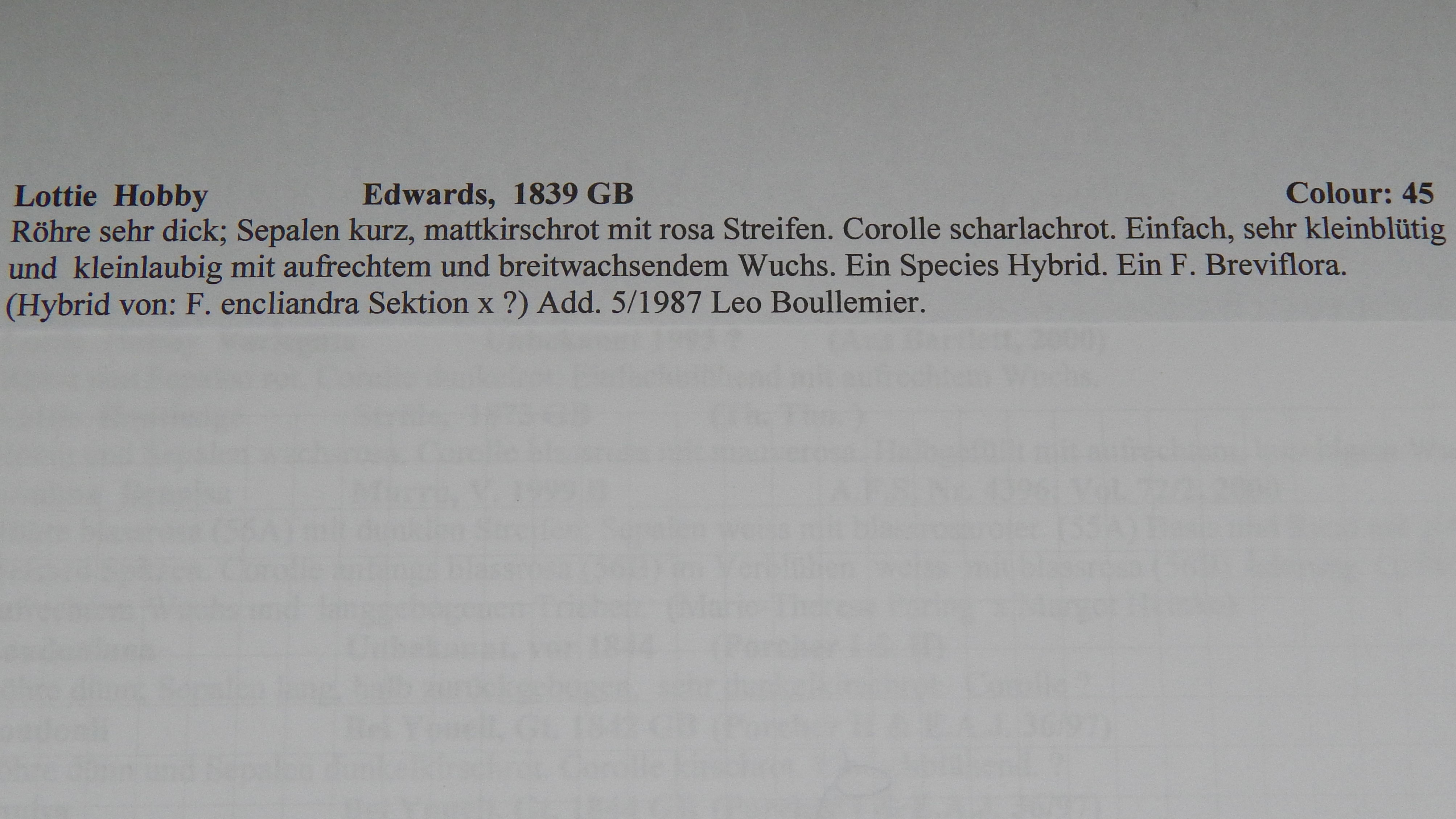 Bei der 'Lotti Hobby' handelt es sich wohl nicht um eine gezüchtete Fuchsie, sondern in der Natur entstandene Hybride die Edwards 1839 entdeckt hatte.