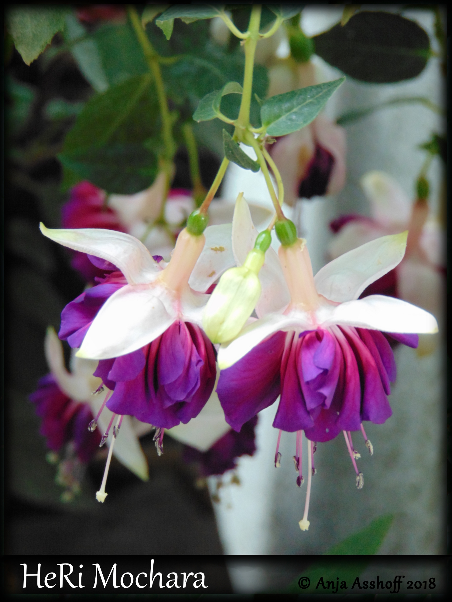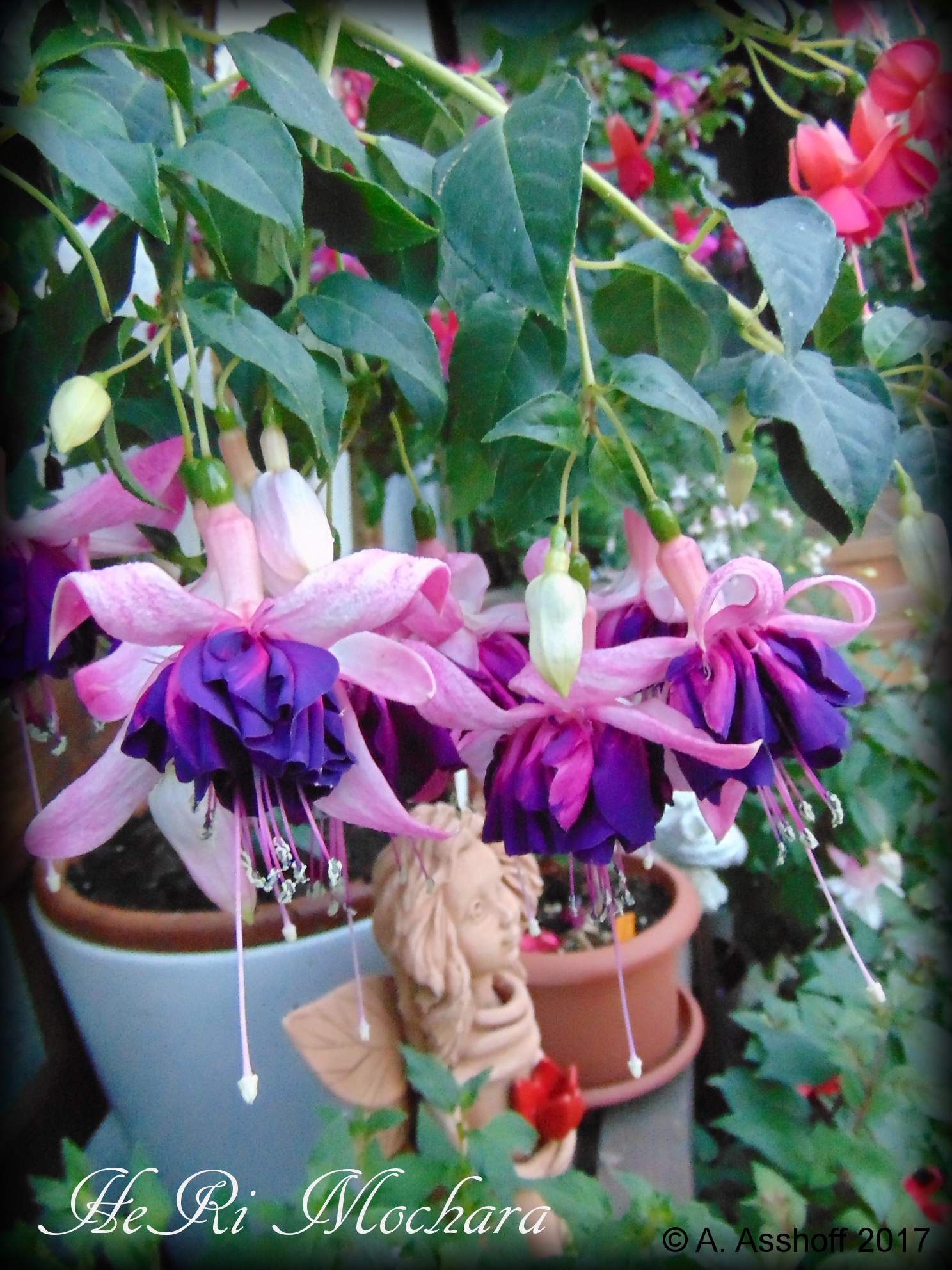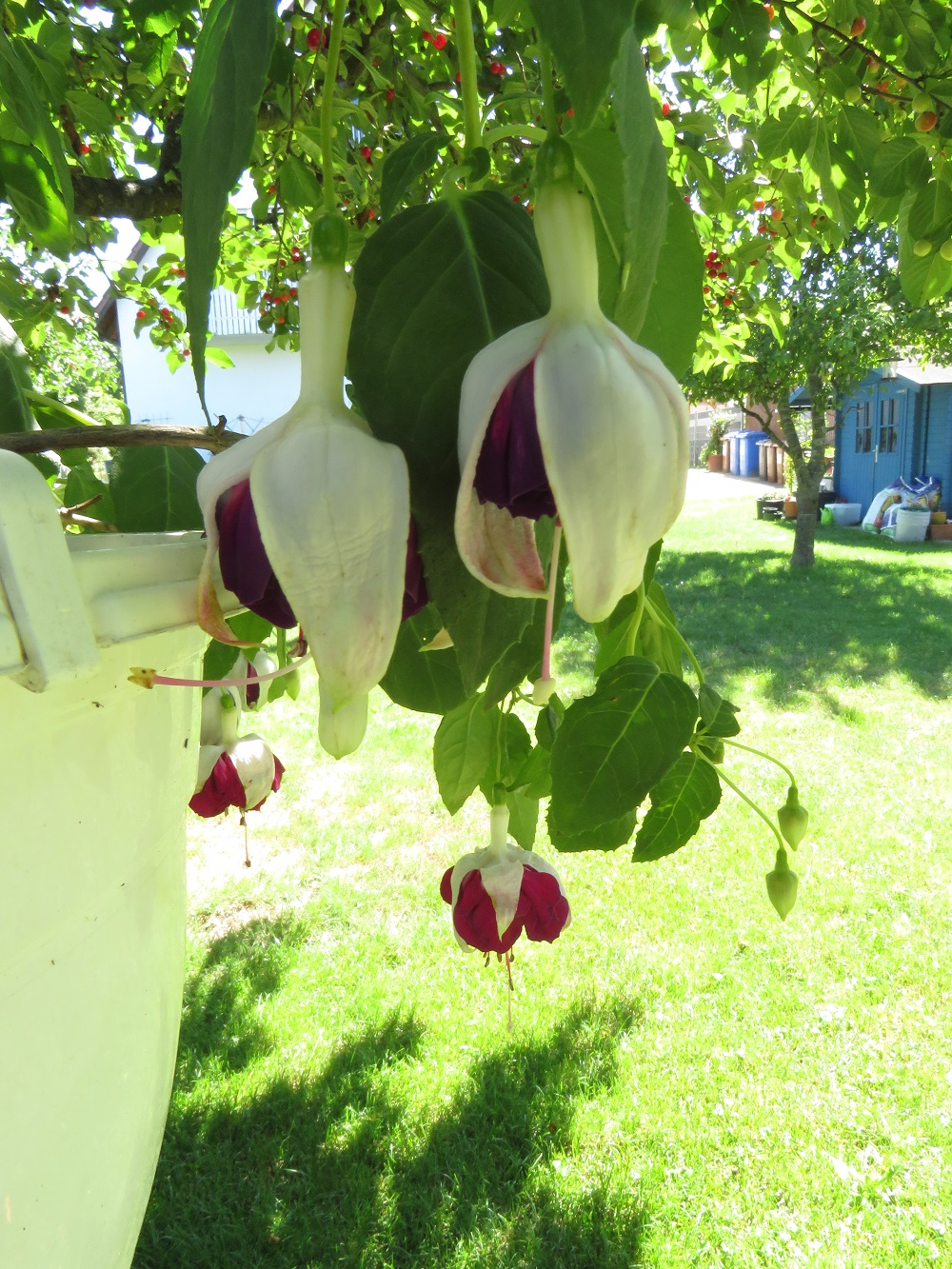 Eigentlich bin ich kein so große Fan von Fuchsien in dieser Farbgebung. Aber an dieser Sorte konnte ich damals einfach nicht vorbei und nun habe ich ein sehr üppiges Bäumchen vorm Haus an der Nordseite. Dort fühlt sie sich auch am wohlsten.Denn ganz einfach ist sie nicht. Wenn sie dauerhaft blühen soll, dann sollte der Wurzelballen nicht austrocknen. Da reagiert sie sehr empfindlich drauf, auf zuviel Wasser ebenso. Sie braucht für ihre großen Blüten eine gute Düngergabe. Jungpflanzen sind auch nicht so einfach zu überwintern. Sie sollte recht trocken gehalten werden während der Ruhepause. Nasse und kalte Füssen befördern sie fix ins Jenseits. Wenn man aber ein paar Dinge beachtet, dann wächst sie zu einem stattlichen großen Exemplar heran, welches dann winters auch nicht mehr so empfindlich ist.