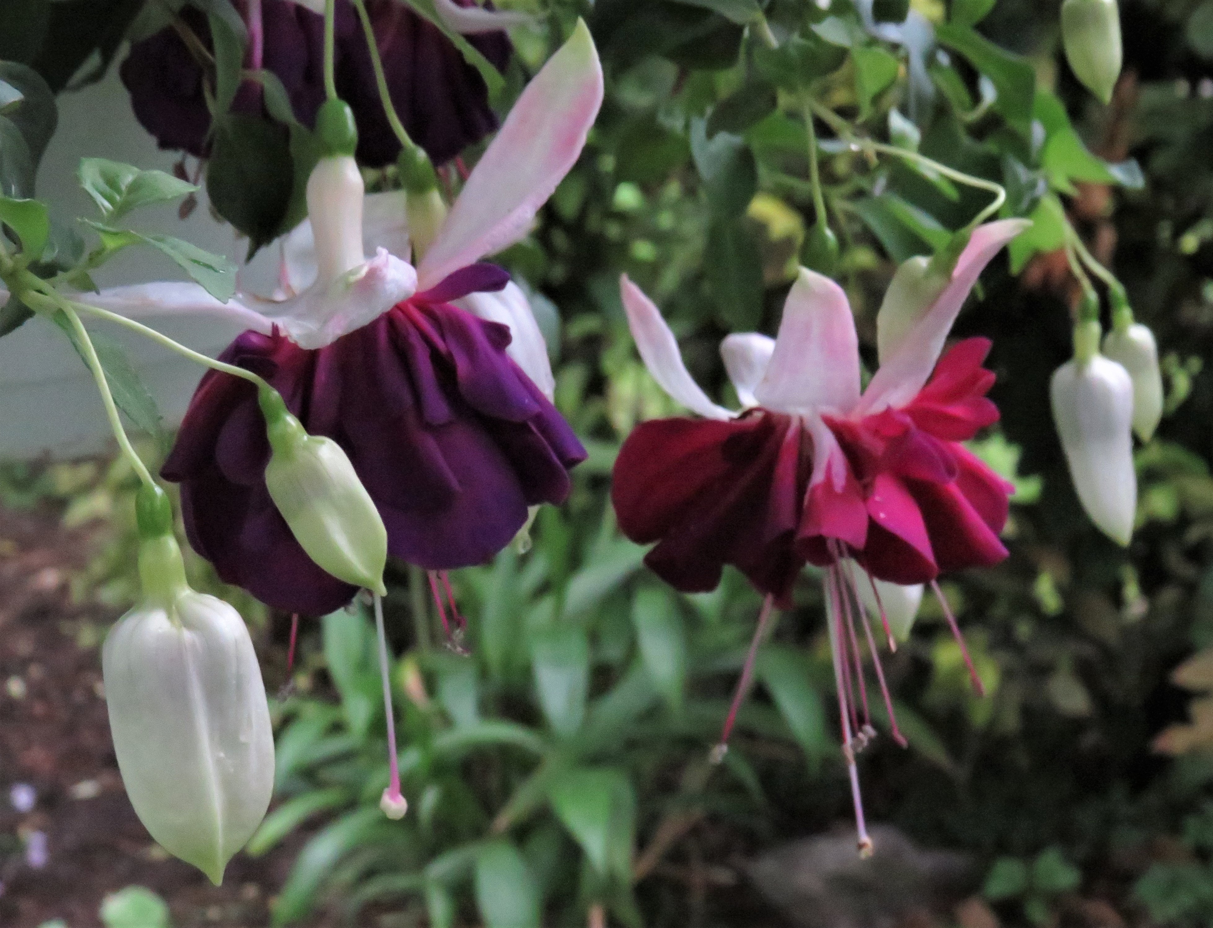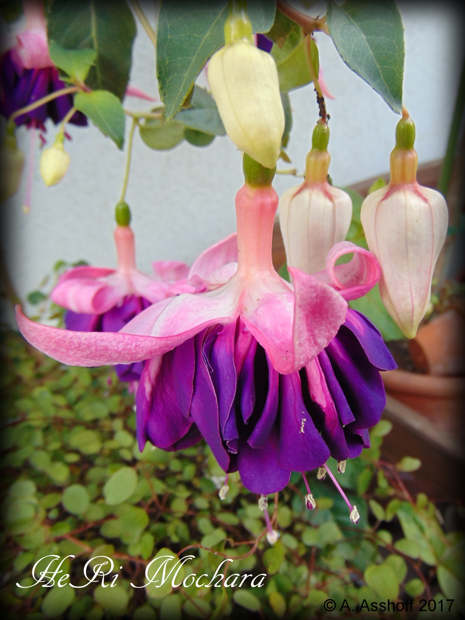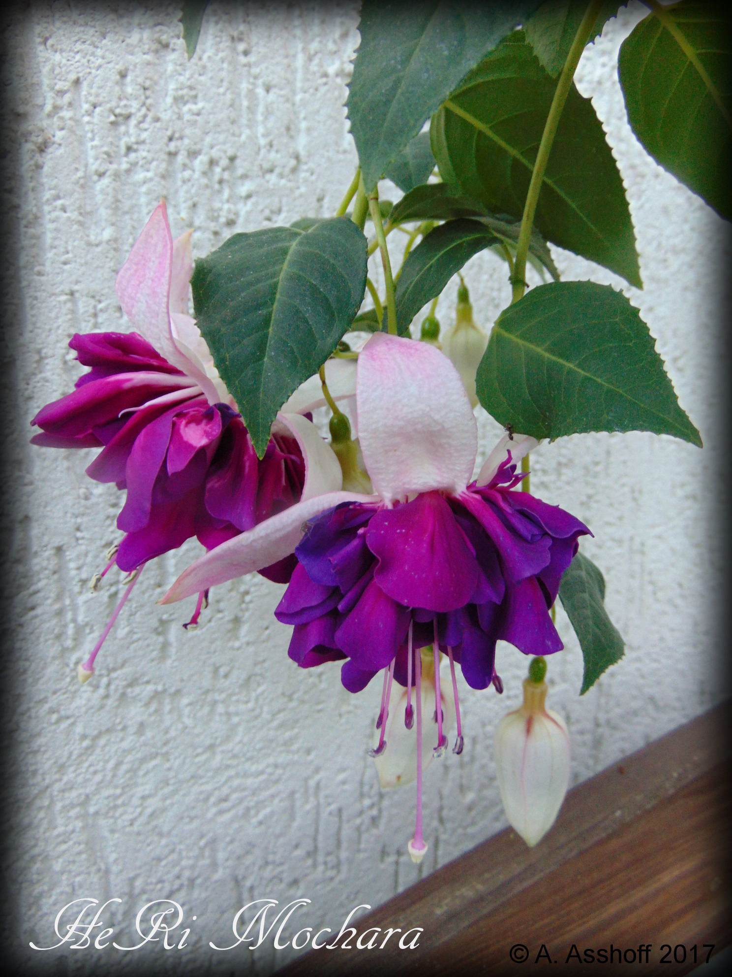 Eigentlich bin ich kein so große Fan von Fuchsien in dieser Farbgebung. Aber an dieser Sorte konnte ich damals einfach nicht vorbei und nun habe ich ein sehr üppiges Bäumchen vorm Haus an der Nordseite. Dort fühlt sie sich auch am wohlsten.Denn ganz einfach ist sie nicht. Wenn sie dauerhaft blühen soll, dann sollte der Wurzelballen nicht austrocknen. Da reagiert sie sehr empfindlich drauf, auf zuviel Wasser ebenso. Sie braucht für ihre großen Blüten eine gute Düngergabe. Jungpflanzen sind auch nicht so einfach zu überwintern. Sie sollte recht trocken gehalten werden während der Ruhepause. Nasse und kalte Füssen befördern sie fix ins Jenseits. Wenn man aber ein paar Dinge beachtet, dann wächst sie zu einem stattlichen großen Exemplar heran, welches dann winters auch nicht mehr so empfindlich ist.