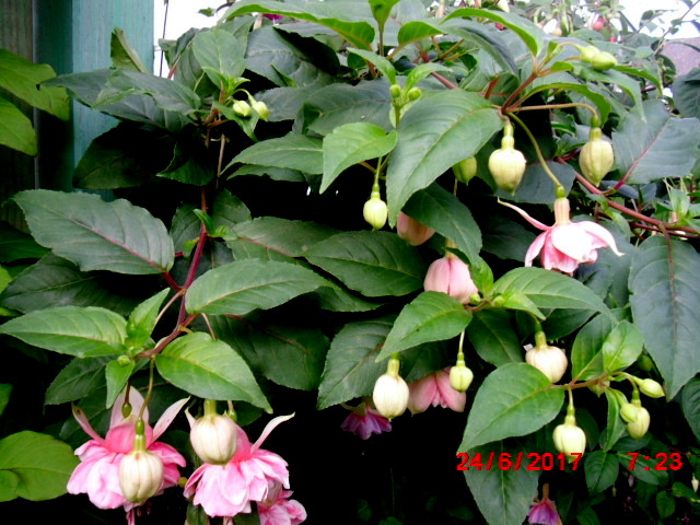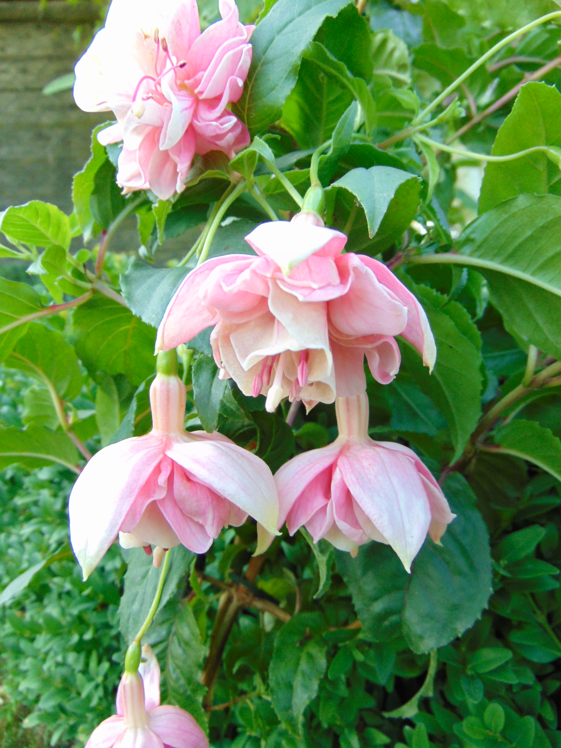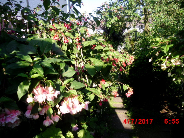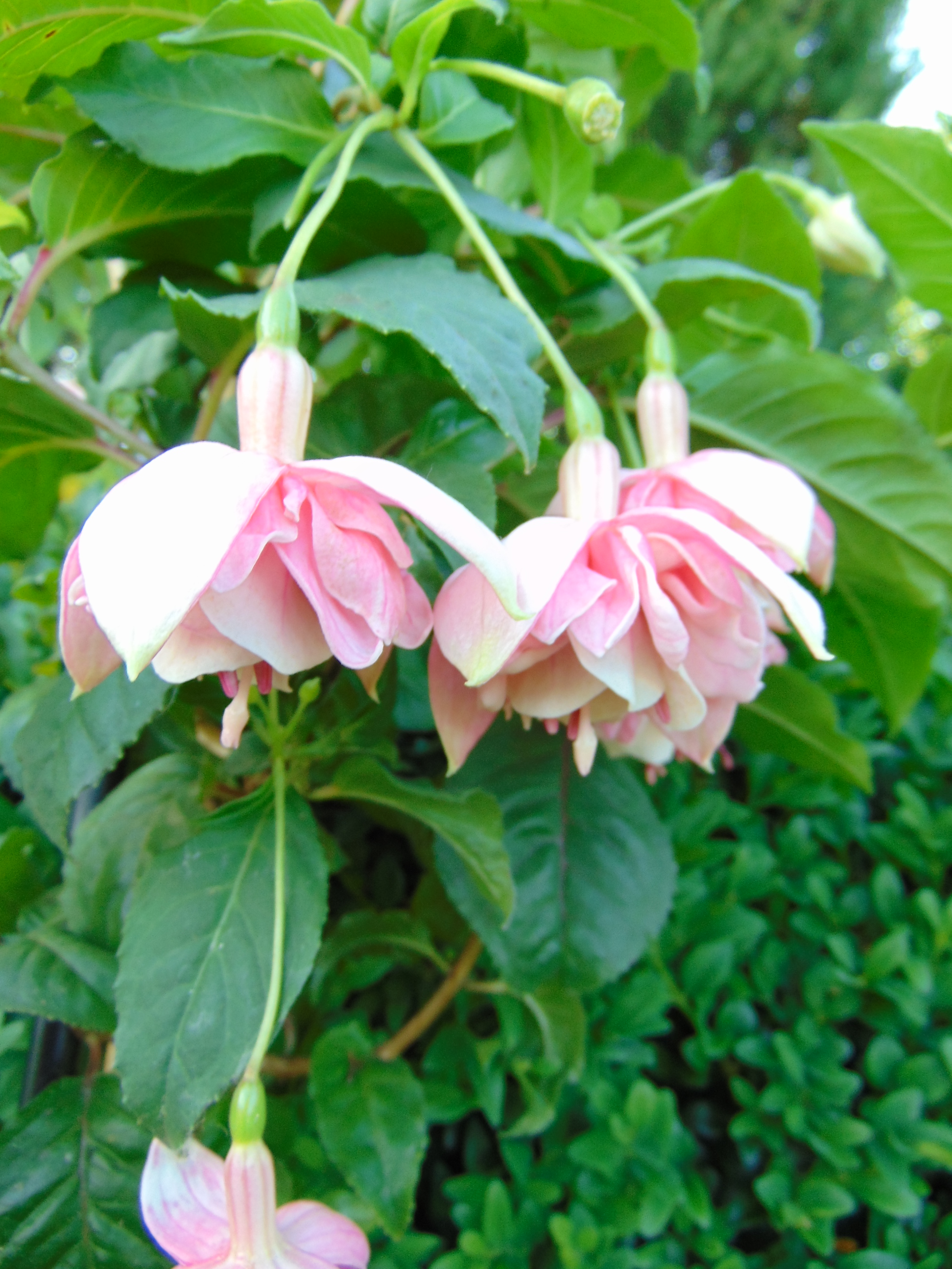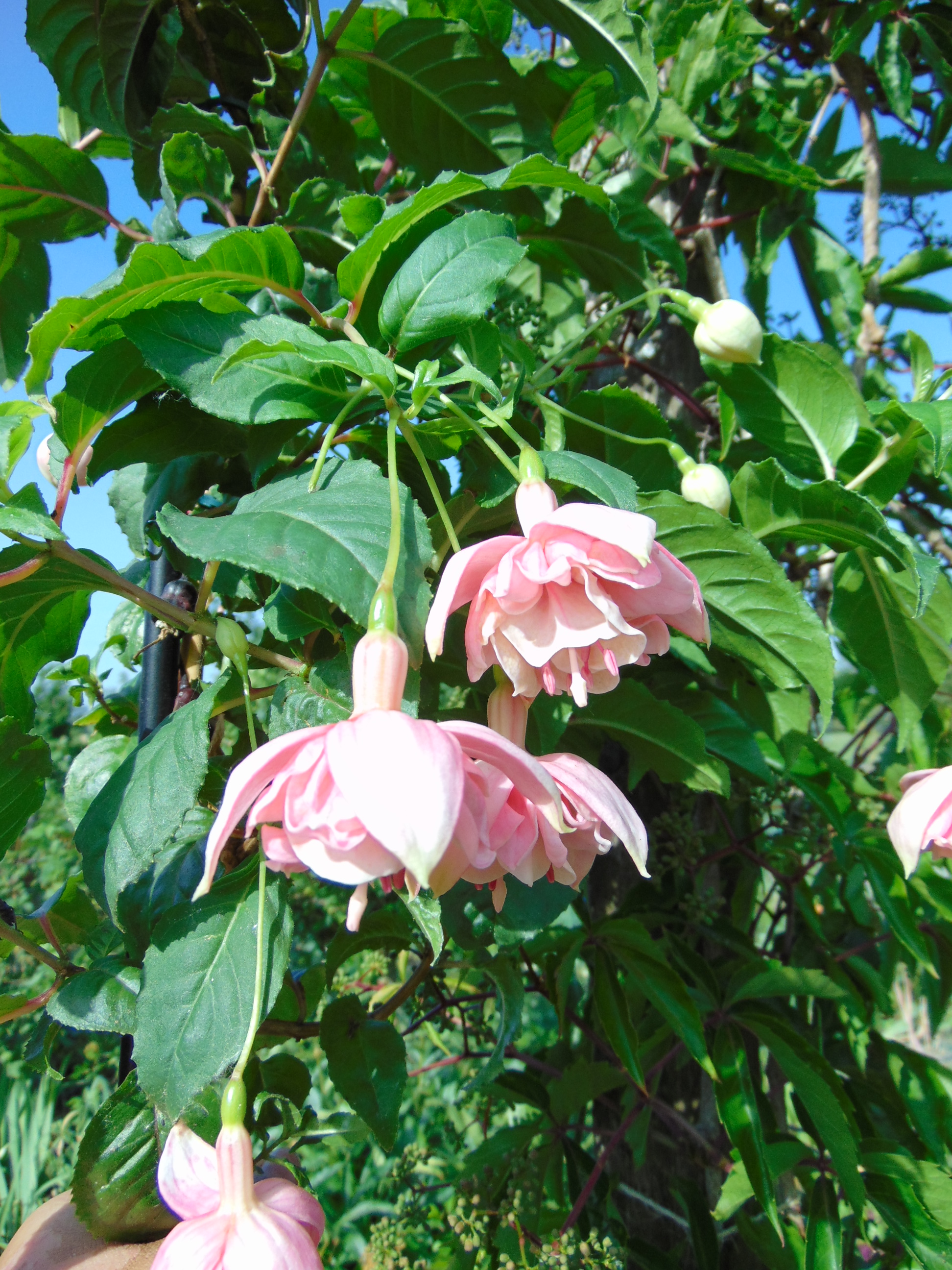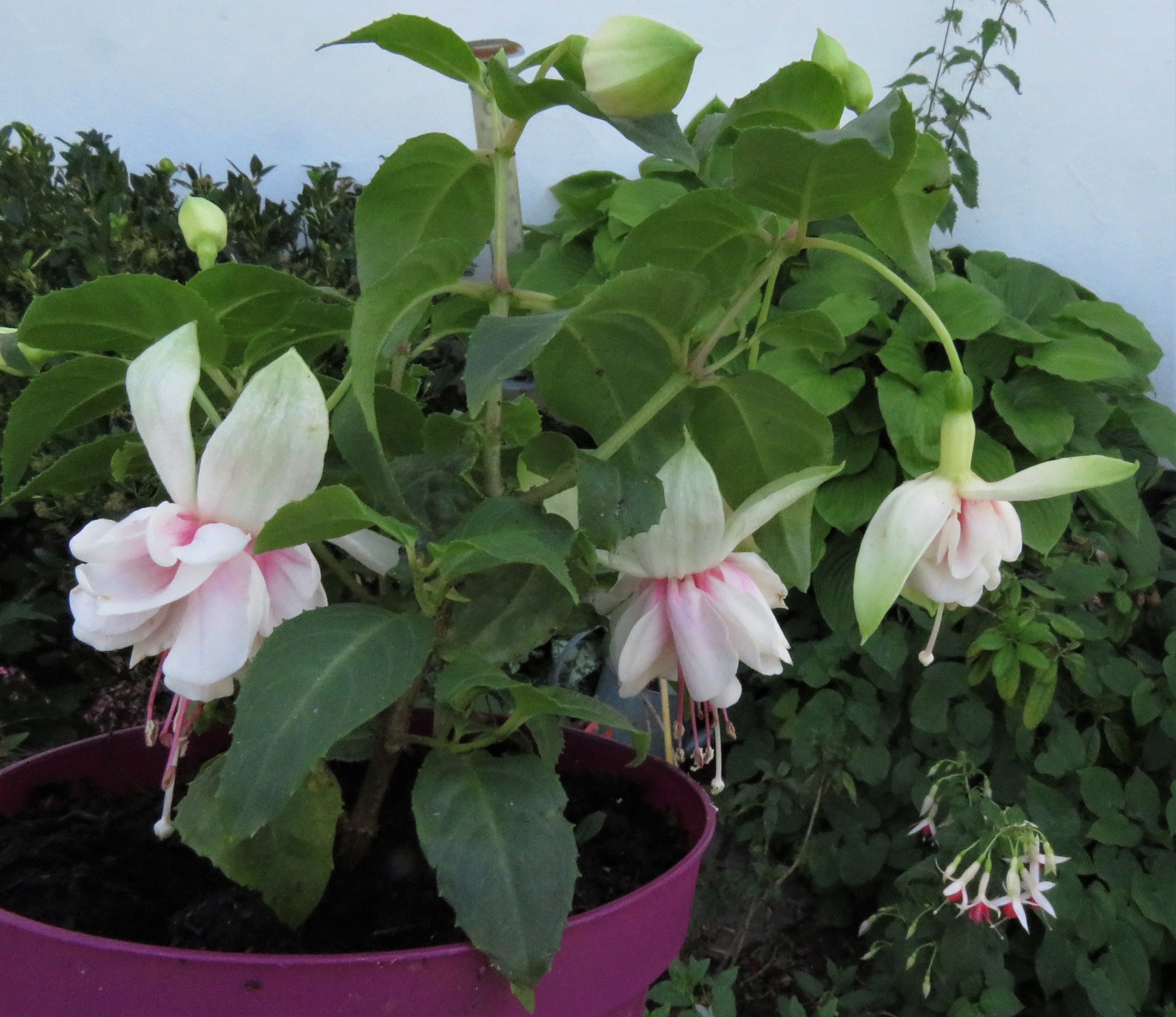 Diese Fuchsie hat eigentlich fast nur gute Eigenschaften. Sie ist eine Kreuzung von 'Grundlsee' x 'Pink Marshmallow', wächst aufrecht und sehr gut. Was auch sehr schön ist: Die Blüten verregnen nicht und sind sehr fest und haltbar. Auch Hitze verträgt sie gut. Was sie allerdings gar nicht mag, ist Sonne. Ein halbschattiges Plätzchen am Apfelbaum gefällt ihr bei mir am besten. Passt der Standort, ist sie auch sehr blühwillig.