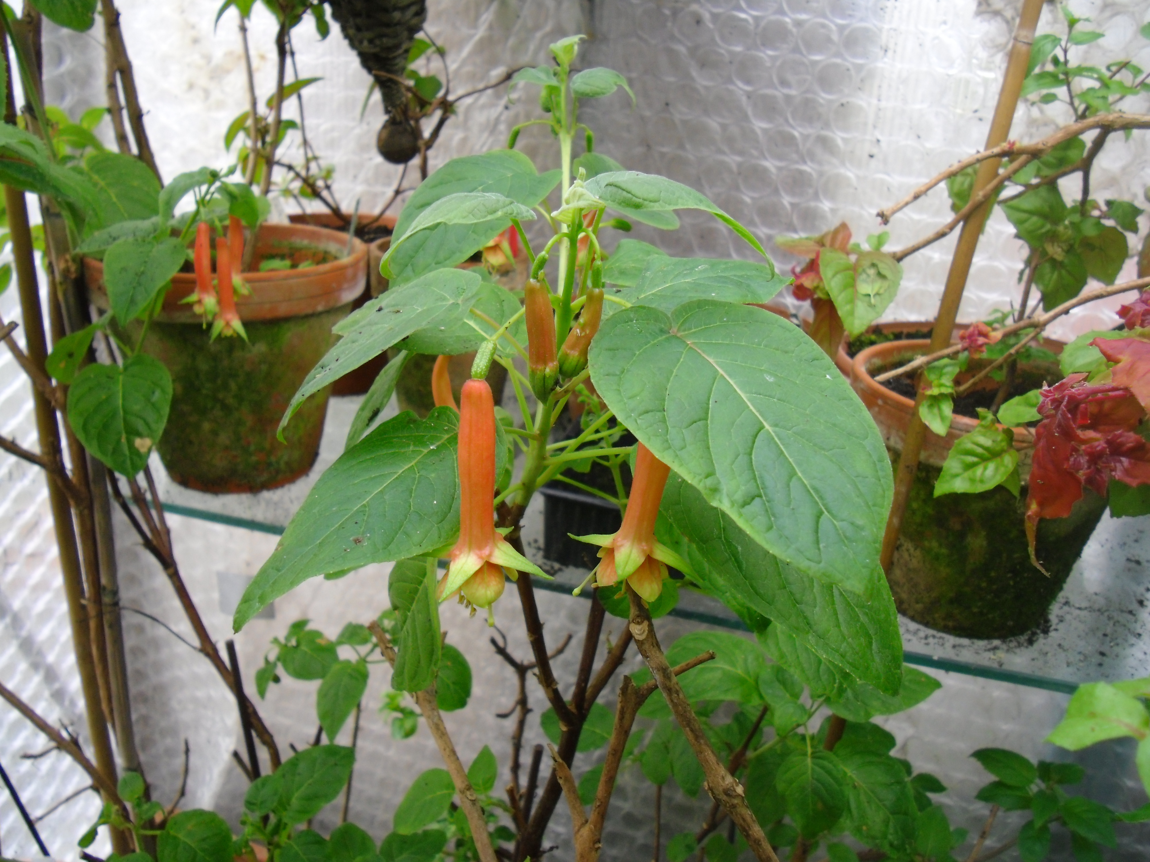 Die gelbe Fuchsie ist wohl der Wunsch eines jeden Züchters und selbst Hobbyzüchter versuchen sich daran und wenn man sieht, was Martin Beije 1994 schon hervorgebracht hat, dann kann es gar nicht mehr solang dauern. Die Korolle dieser Fuchsien ist tatsächlich gelb genau so wie ihre Staubfäden. Er kreuzte damals einen Sämling von F. fulgens mit der F. pilaloensis. Und die Eltern sieht man dieser Sorte auch noch heute an. Das Laub und auch sie Blüten sind regelrecht flauschig. Sie liebt einen sonnigen Standort, im Halbschatten sind die Blüten sehr pastellfarben. Sie blüht den Sommer über fast ohne Pause. Vor 2 Wochen hab ich Stecklinge gesetzt, die hatten nach 5 Tagen schon kräftige Wurzeln. Das ist rekordverdächtig! Die Überwinterung ist ebenfalls problemlos. Aber leider will sie einfach keine Beeren ausbilden. Die Fruchtknoten werden samt Blüte abgeworfen. Ich kreuze ja auch sehr gern :D