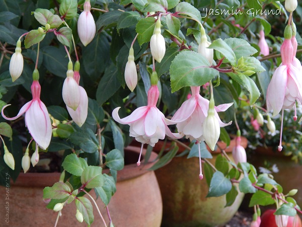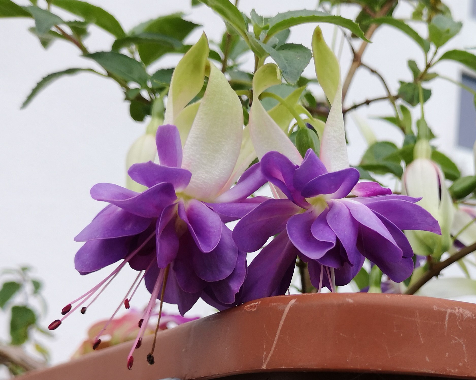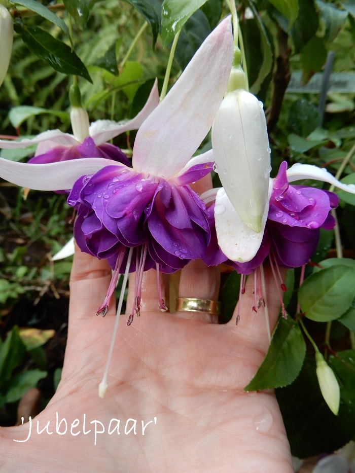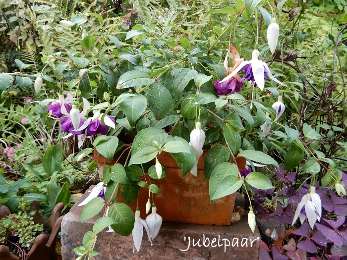 Die Blüten sind besonders schön. Das Weiß der Sepalen/Tubus ist wirklich weiß. Der Kontrast zu den blauen Korollen, die sich, wie alle je älter leider pink/lila verfärben, lassen die Fuchsie sehr frisch wirken.