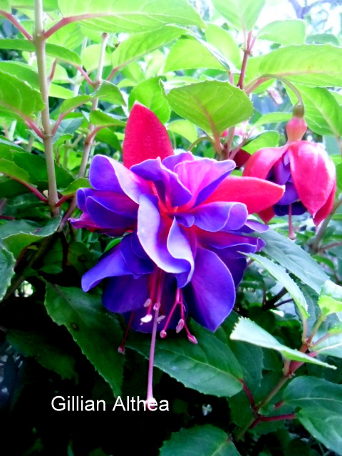 Ein helleres rot-blau zeigt diese gefüllte Fuchsie hübsch doch recht normal.Nach diesem Winter hat sie ein wenig gekränkelt doch mittlerweile macht sie sich wieder.Es dauert bis man ein Stämmchen hat Holly´s Beauty