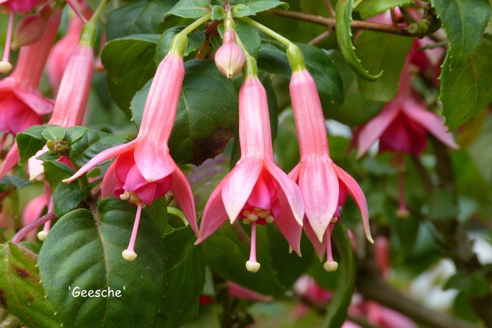 Eine bekannte Fuchsie, die Fans und "Nichtfans" hat. Obwohl vom Triphylla-Typ, verträgt sie offensichtlich nur bedingt volle Sonne, die verschieden Quellen variieren zwischen Sonne und Halbschatten. Ein Elternteil ist die "Leverkusen", der andere ist unbekannt. Die Blüte erscheint in verschiedenen Rosa-Tönen (Tubus pink, Sepalen dark rose bis red, Korolle margenta).