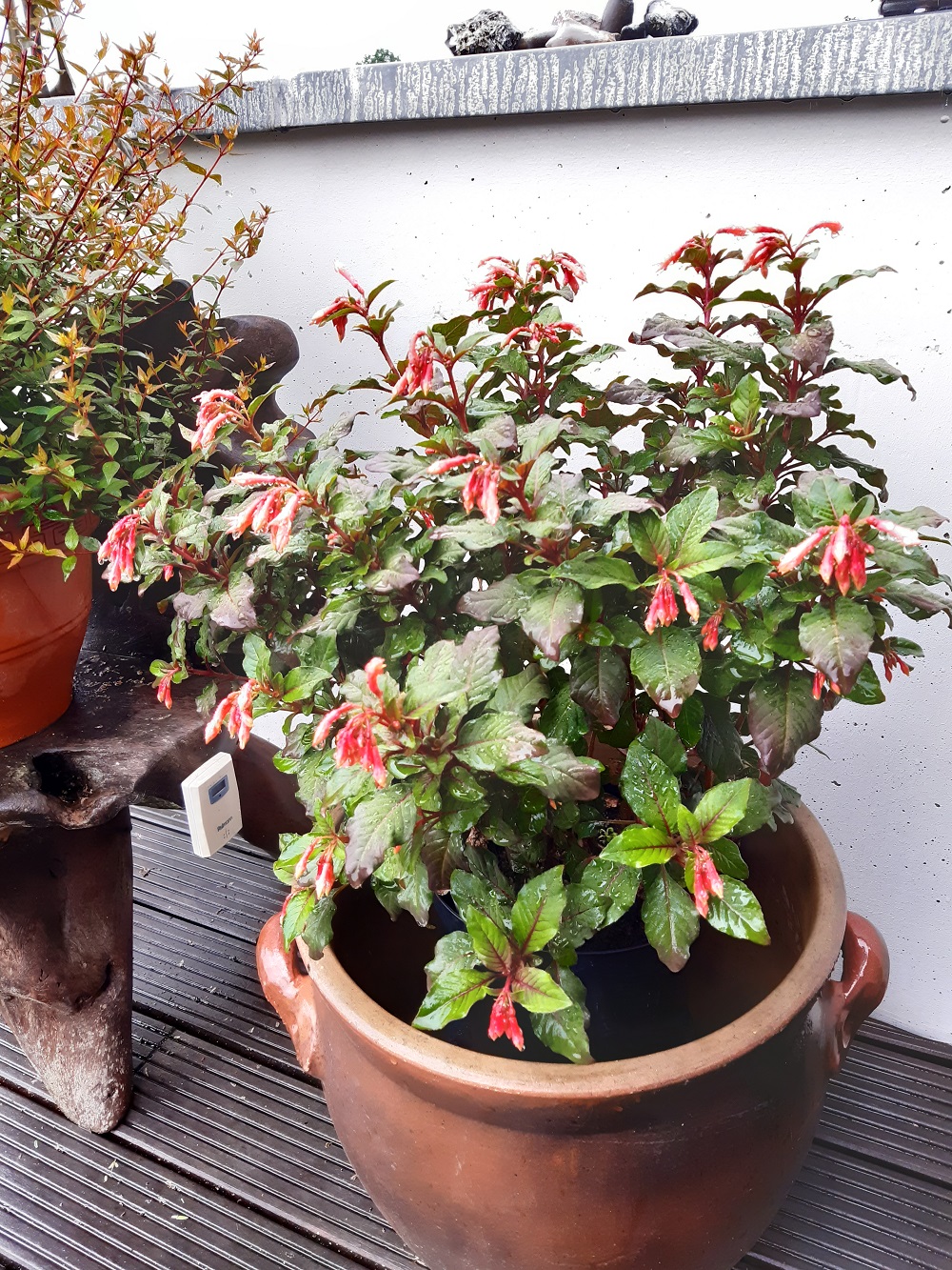 Auf der ständigen Suche nach relativ sonnenfesten Fuchsien bin ich auf diese gestoßen und habe mir eine ca. einjährige Pflanze und einen gerade bewurzelten Steckling bestellt.