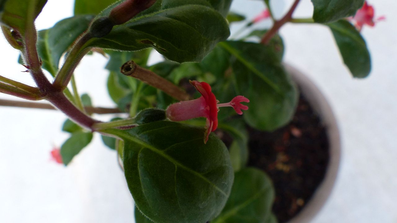 Meine Pflanze fiel mir auch dadurch auf, dass sie zeitweilig 10 winzige Blüten und 10 große Beeren hatte (ohne Foto, ich entferne die Beeren meistens). Leider hatte ich keinen Steckling gemacht und kann meine Fuchsien nur dunkel im ungeheizten Keller oder in der geheizten Wohnung überwintern. Ich muss sie daher in den Keller bringen. Heute hat sie 1 Samenbeere, aber die Pflanze steht inmitten von anderen klitschnassen Fuchsien, da hole ich sie jetzt nicht raus. Daher hier noch ein paar ältere Fotos. Ob die "Schwankung" der Blütenfarbe echt ist oder "lichteinfallbedingt", weiß ich leider nicht. In einer bekannten Datenbank (ich bin dort Spender...) wird die Blütenfarbe so angegeben: Mit freundlichen Grüßen vom Müggelsee