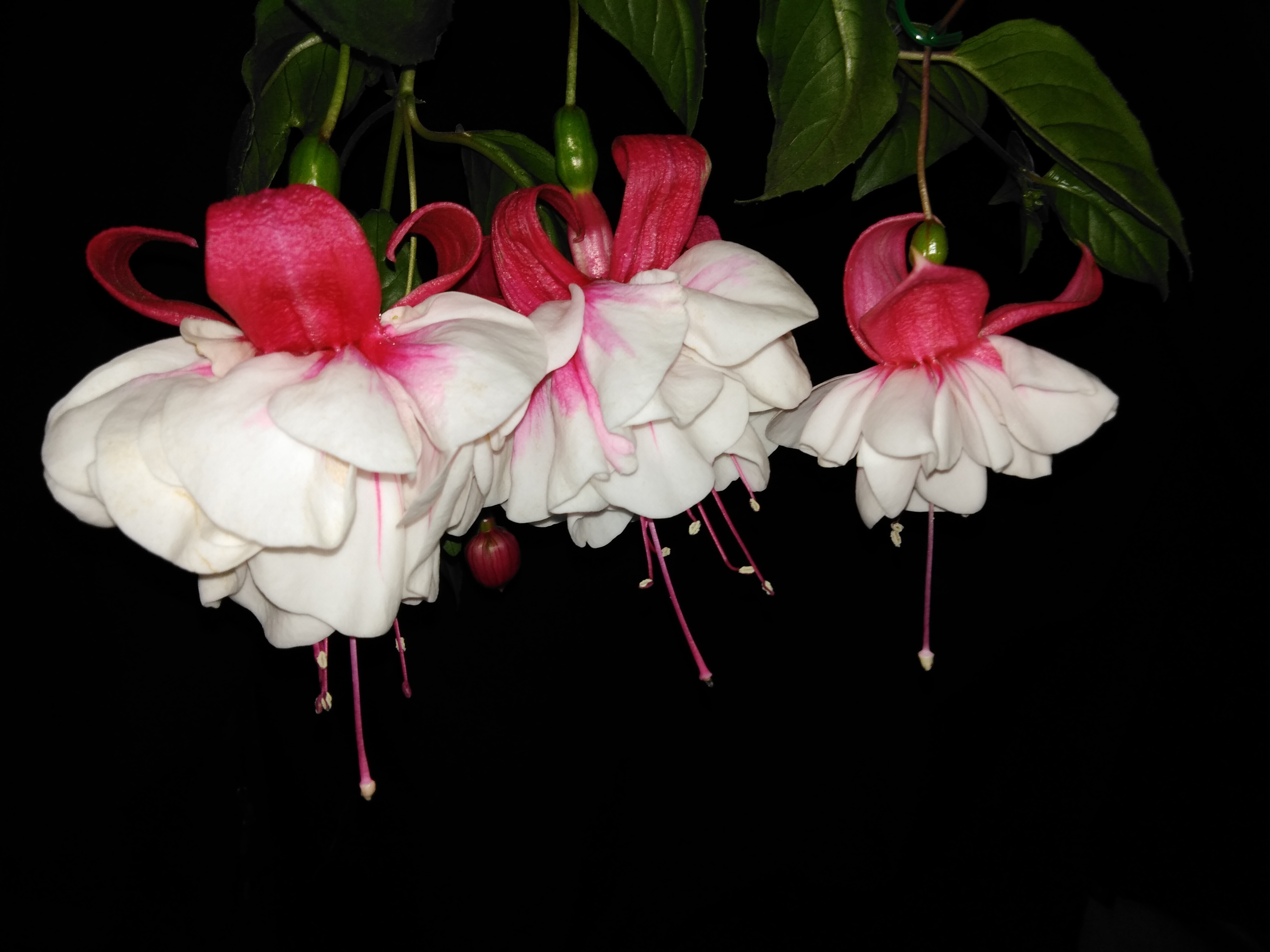 Snow Burner ist für mich eine der Fuchsien wie vielseitig diese Pflanzen sein können. Obwohl eine von vielen rot-weißen Sorten, besticht sie durch ihre Größe und füllige Blüte. Um den Unterschied in der Größe zu verdeutlichen ist auf dem Bild mit den 3 Blüten eine Lassie (die rechte Blüte) von mir als Vergleich daneben gehangen worden. Lassie hat eine vergleichbare Größe wie die bekannte Swingtime.