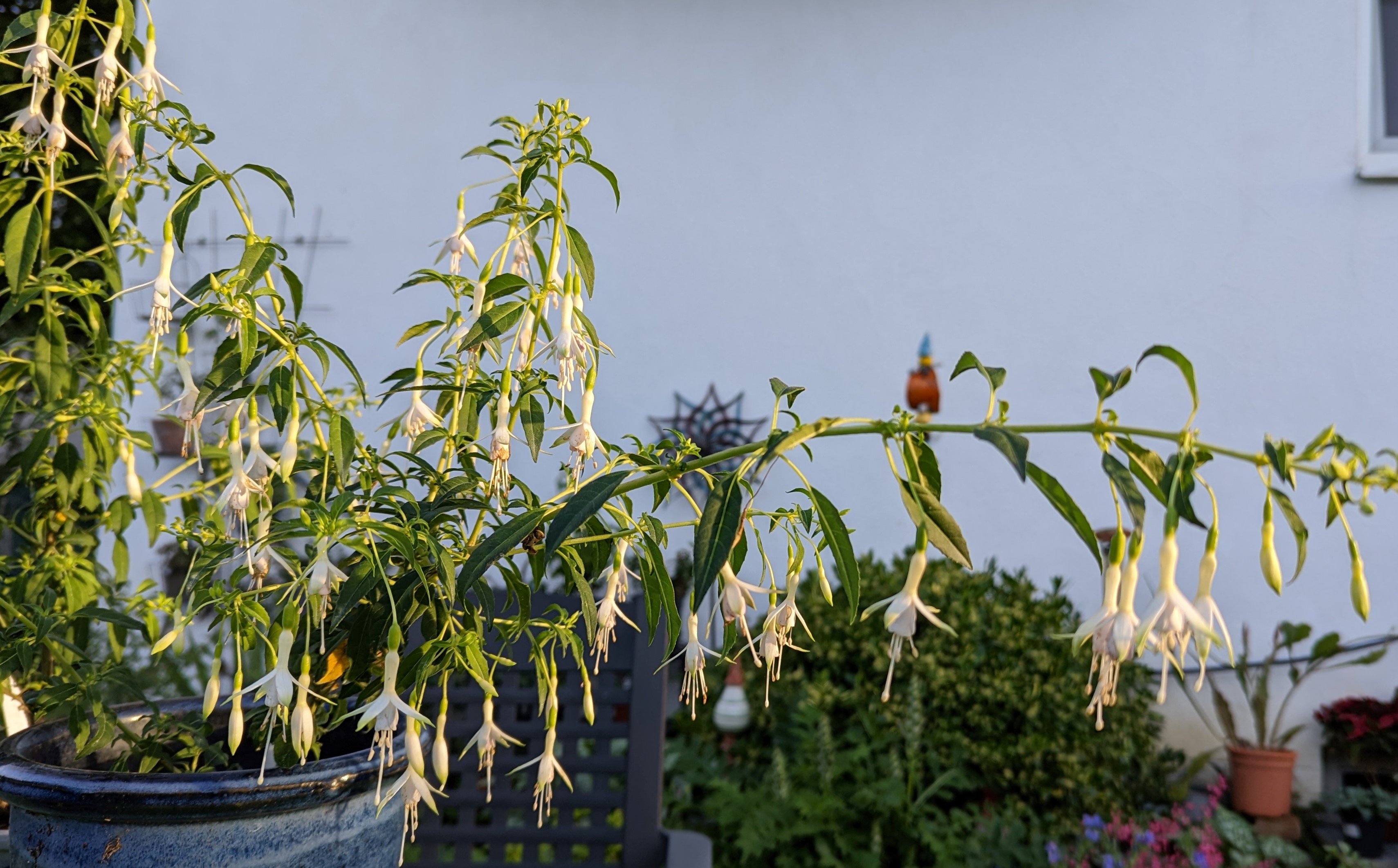 Die erste draußen überwinterte Fuchsie, die blüht, wenn auch etwas verhalten im unteren Bereich ist die Logan woods Alle anderen sind dieses Jahr erst gepflanzt und hatten schon beim Kauf Blüten oder haben über Winter, weil sia ja nicht ausgepflanzt waren, Knospen angesetzt! Bin gespannt wann die nächsten kommen!