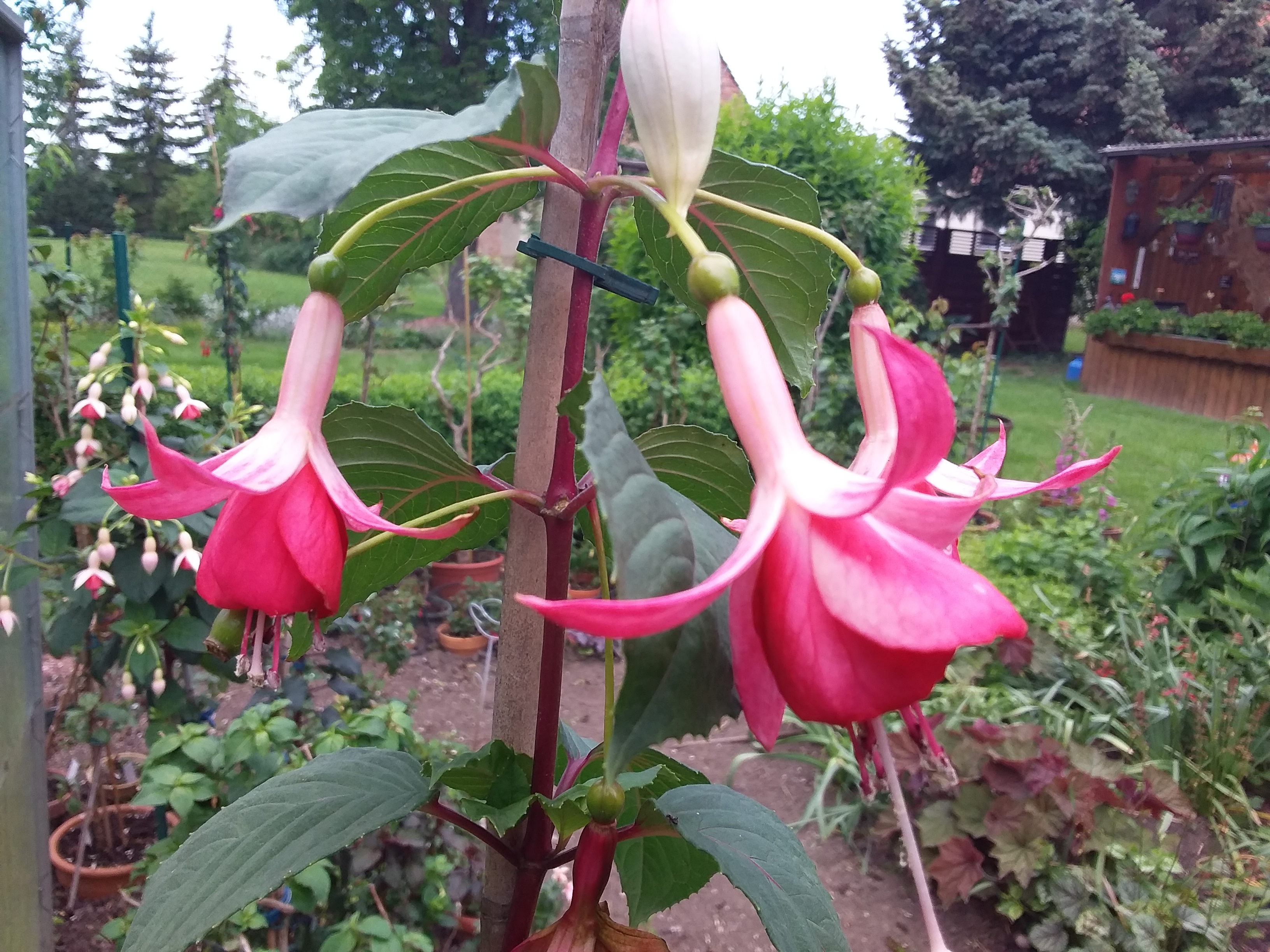 Da sie immer unbeobachtet zwischen meinen anderen Fuchsien stand, ist sie in die Höhe geschossen und hat auch wenig Seitentriebe gemacht. Da sie aber sehr einfach in der Pflege ist, werde ich wohl mal mit der Gestaltung einer buschigen Pflanze beginnen und habe ihr einen Steckling an den Fuß gesetzt. Jedenfalls hat sie schon früh mit der Blüte begonnen und verdient schon deshalb mehr Beachtung von mir. :lol: