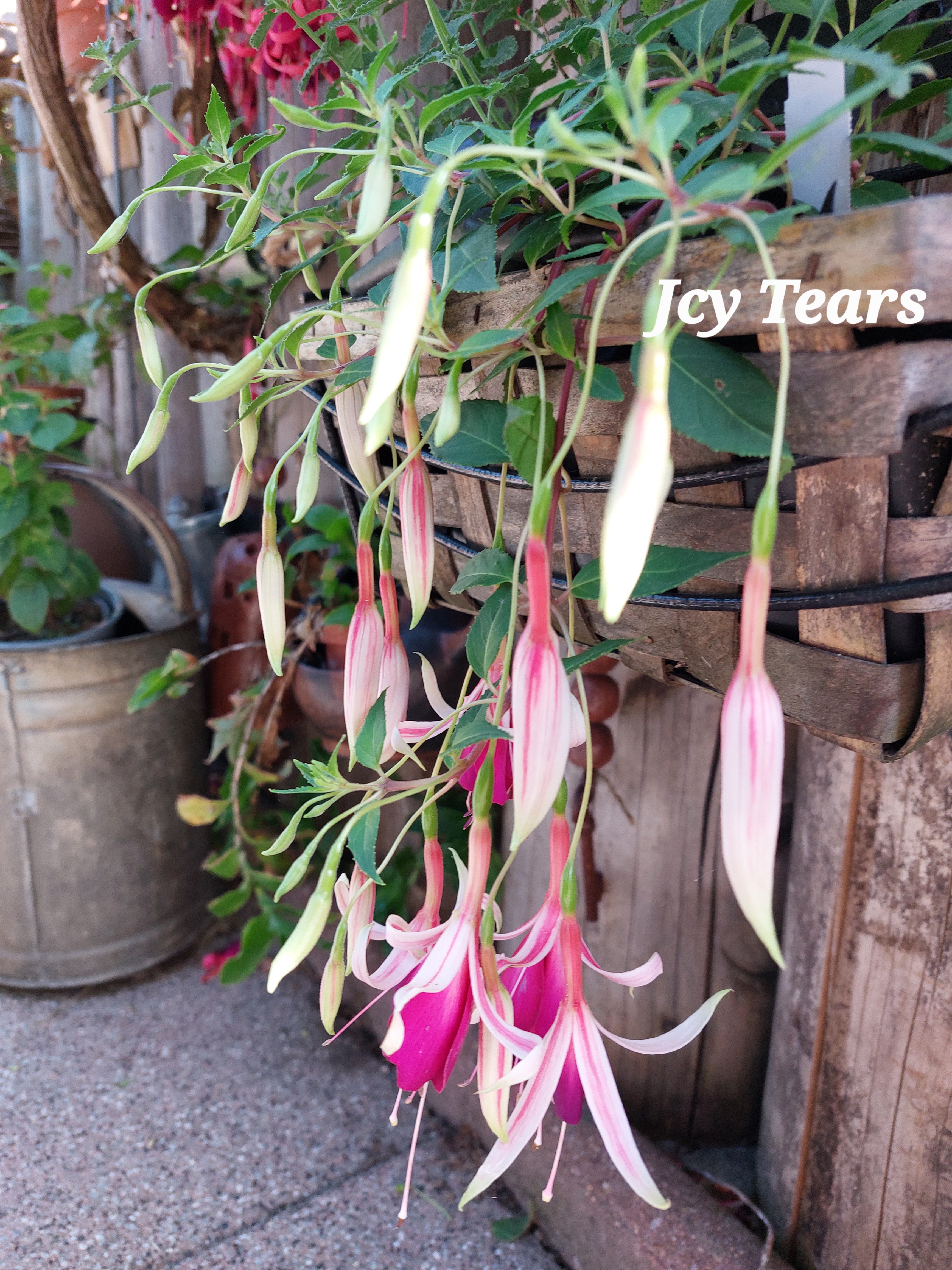 Ich bin mal wieder hier und habe diesen Beitrag über die schöne ’ICE Tears’ entdeckt. ICE Tears ist ein Sport der ’Frozen Tears’ und nicht umgekehrt. Wenn sich in solchen Pflanzen Äste zur Ausgangsform zurückbilden, sollten diese unbedingt zeitnah entfernt werden, weil man sonst wieder die komplette Ausgangspflanze hat, aber wer will das schon bei diesem einmalig schönen Sport. Ich liebe an ihr die gestreiften Blütenblätter. Außerdem mag ich es, wenn Fuchsien so kompakt wachsen. Ich habe im vergangenen Jahr mit einem kleinen Steckling einer lieben Fuchsienfreundin begonnen und dieser Steckling hat im Winterquartier gar nicht aufgehört zu wachsen. Ich habe zwei weitere Stecklinge bewurzelt und alle in eine Ampel gepflanzt. Wer sie sieht, möchte einen Steckling und deshalb sieht einer meiner bewurzelten Stecklinge schon aus wie ein Bodendecker. Die Ausgangspflanze blüht so üppig, dass man davon keine Stevklinge schneiden kann. Für mich ist diese Sorte neuerdings eine der schönsten Ampelfuchsien und wenn die Ampel mal so aussieht, wie ich mir das vorstelle gibt es auch Fotos. Eine Momentaufnahme füge ich aber doch noch gern hinzu.