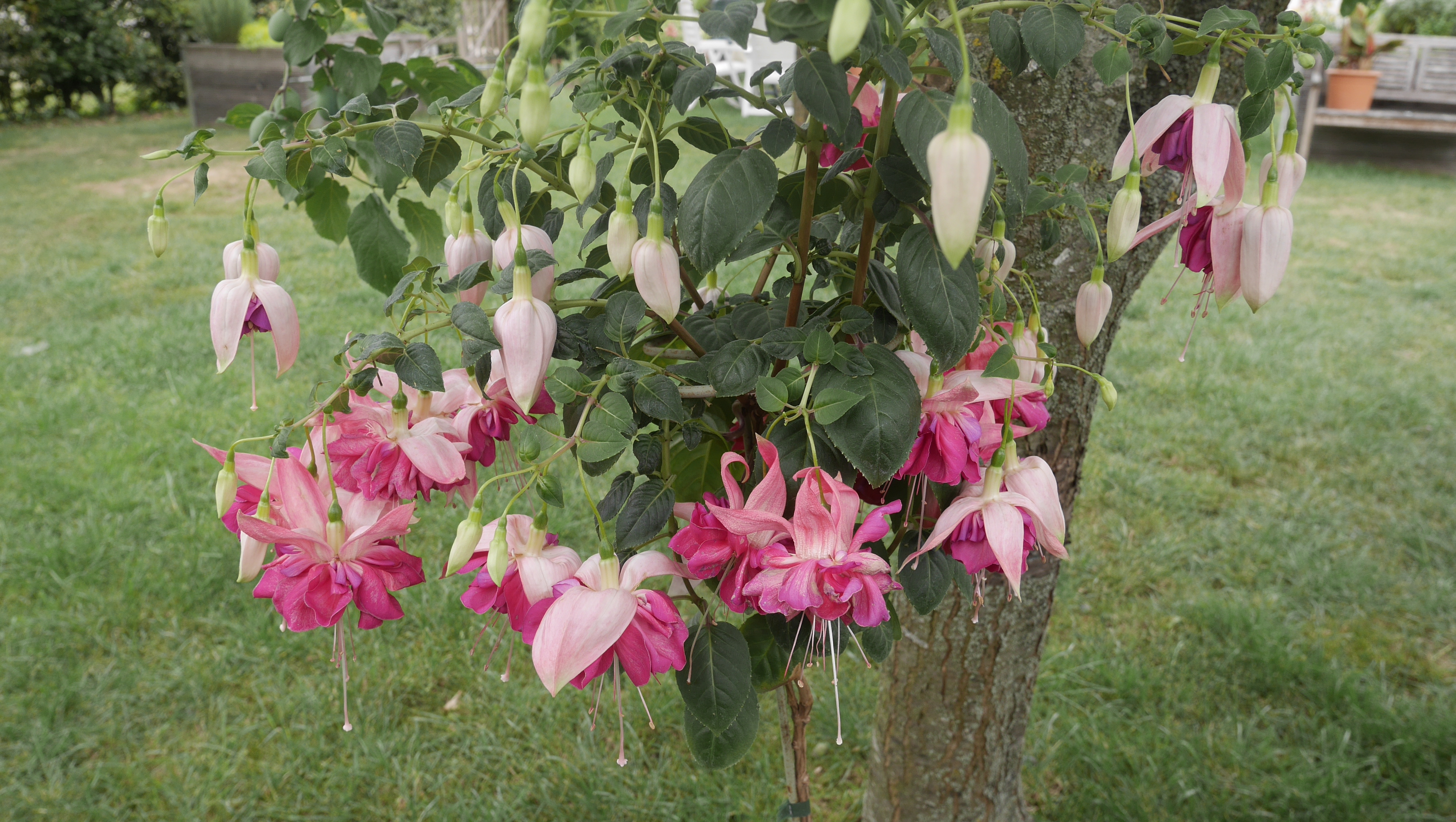 An einem Ast an der Birke hängt meine Ampel "Bella Rosella"