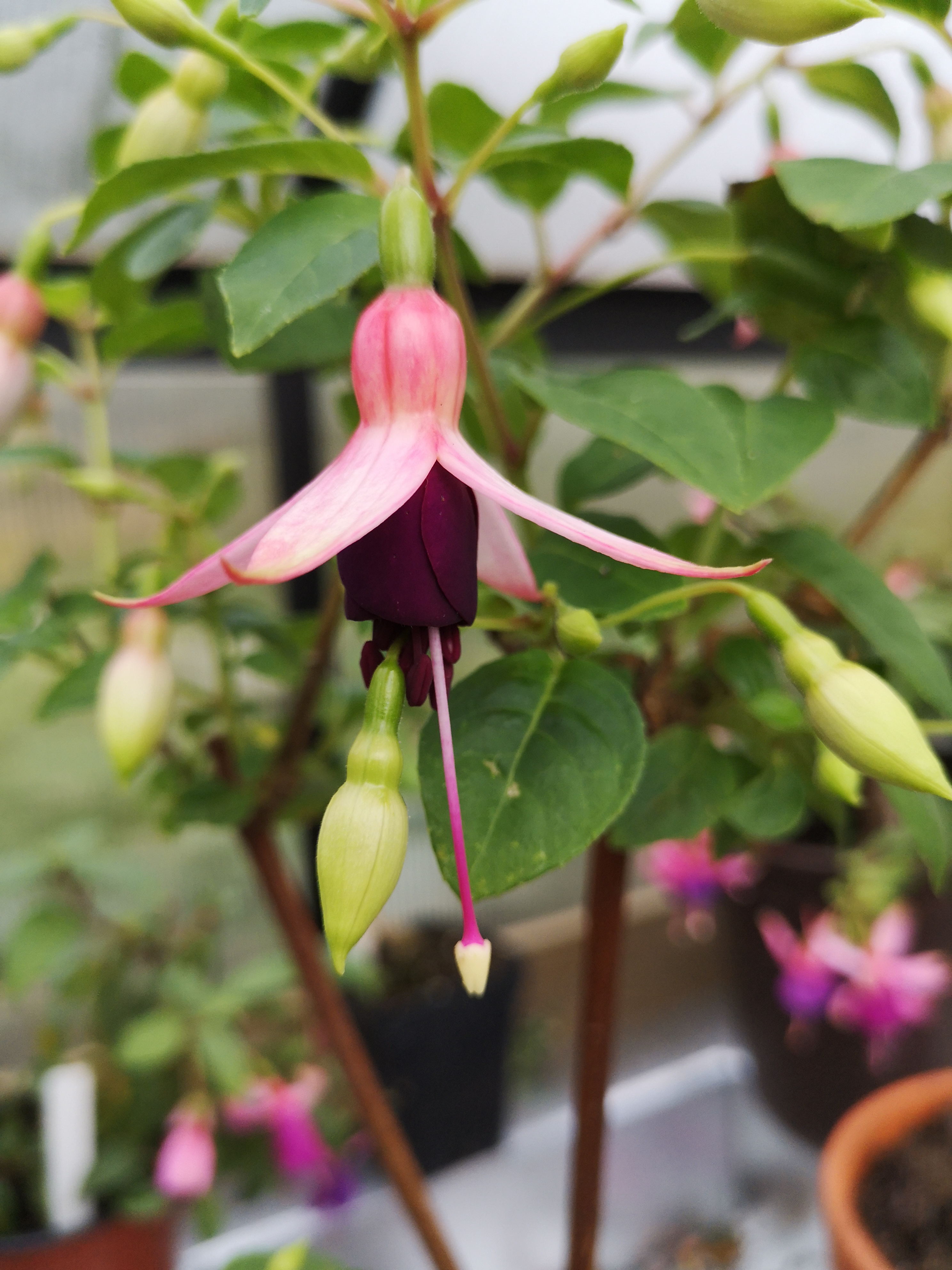 Es ist eine Fuchsie die insgesamt sehr aufgeräumt wirkt. Die Blüten zeigen in allen Stadien ein anderes Aussehen.