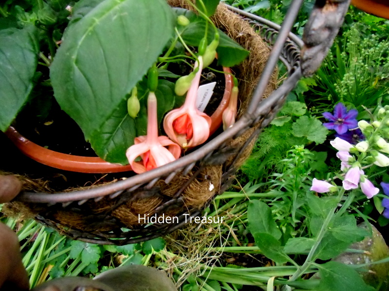 "Hidden Treasue" eine Fuchsie die schon auffällt.Die Sepalen öffnen sich nur selten richtig,so kann man wie durch einen Lampenschirm durchsehen.Die Farbe ien helles orage die Korolle kurz und etwas kräftiger in dr Farbe,Einfach in der Haltung und Beschaffung ist sie nicht.Meist ist sie nicht lieferbar.Dieses Jahr bekam ich drei Stück und alle machen sich gut.