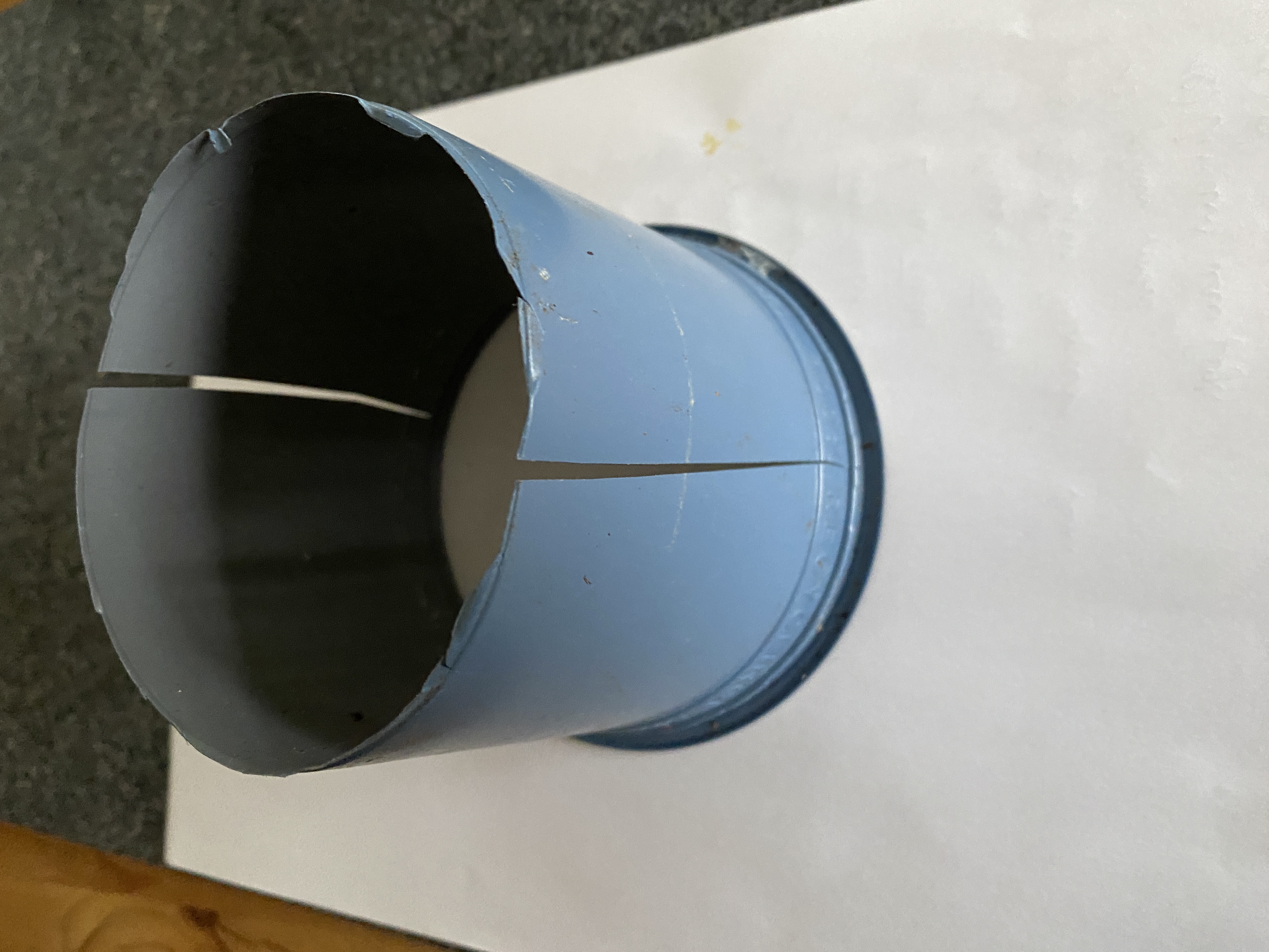 Foto 2 (Topf mit dem abgeschnitten Boden und den seitlichen Schnitten bis knapp unter die Oberkante)