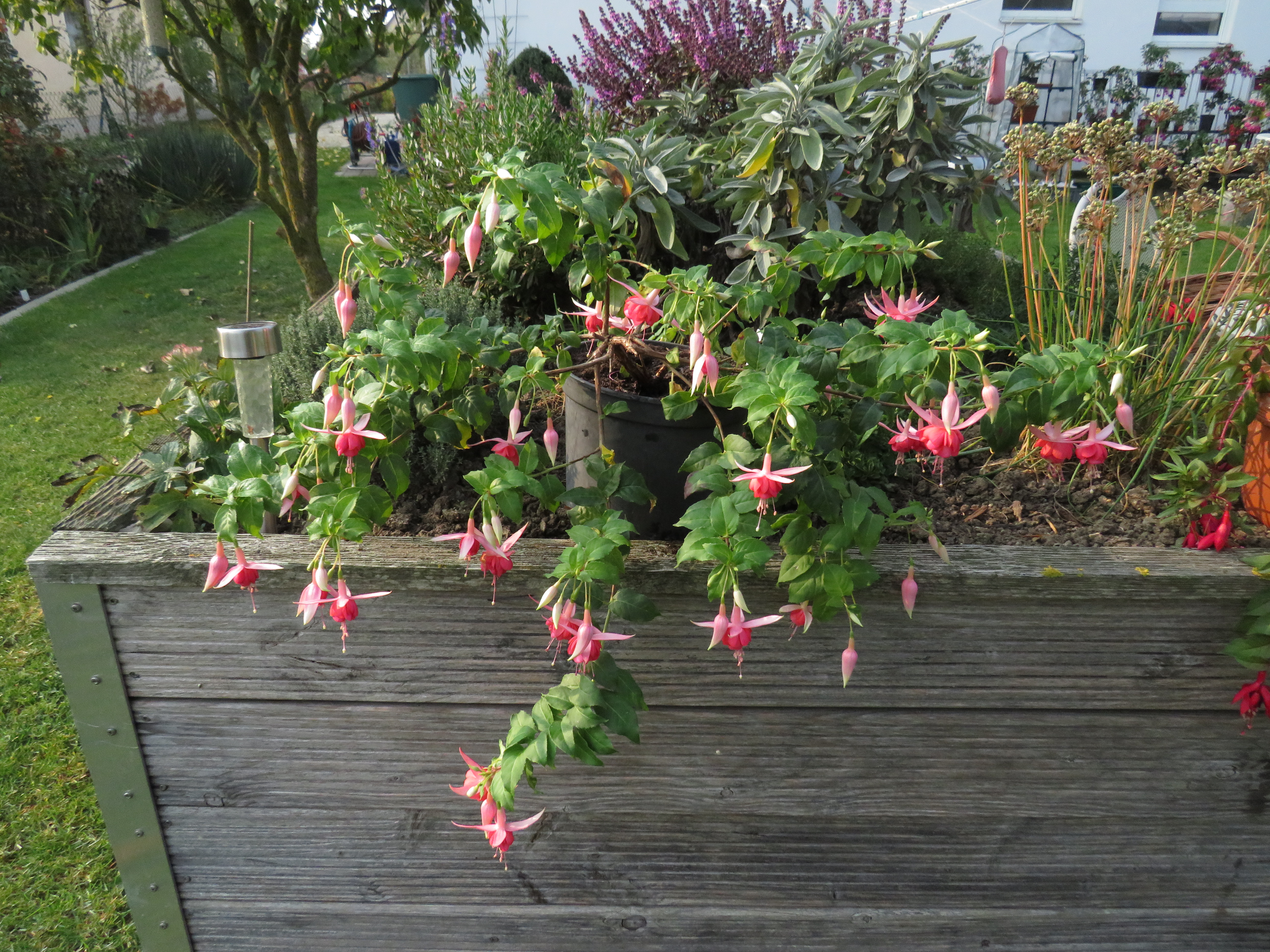 Diese reichblühende Fuchsie habe ich schon ein paar Jahre. Sie hat einfache, lange Blüten. Die Sepalen springen schön auf und manchmal krümmen sich die Knospen. Der Standort kann ruhig sonnig sein. Im letzten Jahr zeigte sie, bei Hitze und Sonne, wie gut sie sich auch dann noch entwickelt.