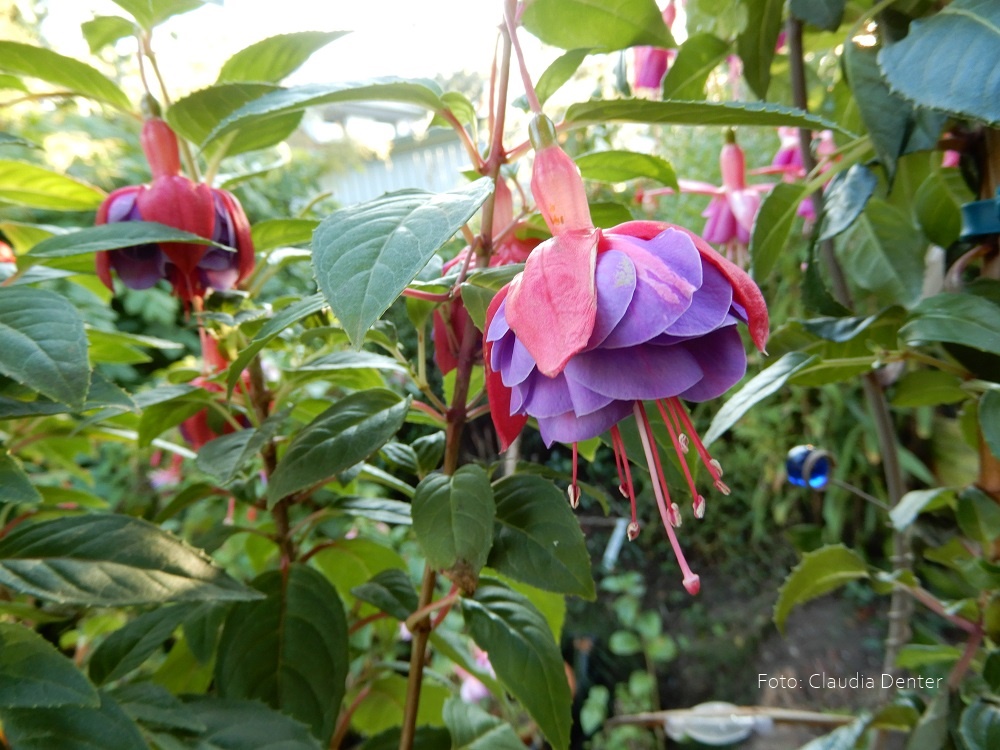 Zunächst erscheinen die geöffneten Blüten ordentlich und zeigen da auch gleich ihr ganzes Farbspektrum Wenn die Blüte ganz aufgegangen ist verändert sich langsam die Farbe von einem zarten lila in ein pink. Die rosafarbenen Streifen in den Petalen bleiben erhalten. Erst nach einer erstaunlich langen Blühdauer verfällt auch die ganze Pracht Die Fruchtknoten muss man natürlich entfernen. Wie die Fuchsie auf Entspitzen reagiert kann ich nicht sagen. Sie treibt etwas spät aus, was für mich der Grund ist von Entspitzen abzusehen. Sie blüht aber auch so wunderbar.