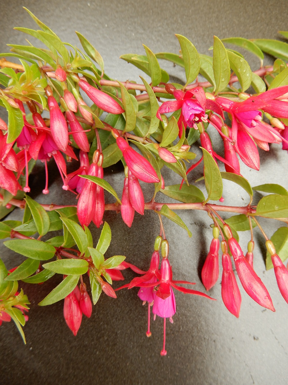 Diese bemerkenswerte Fuchsie bekam ich vor ein paar Jahren von Hans Jürgen Schnur. Bemerkenswert ist sie deshalb, da sie im Topf, ohne zu entspitzen, tatsächlich meterlange Triebe macht.