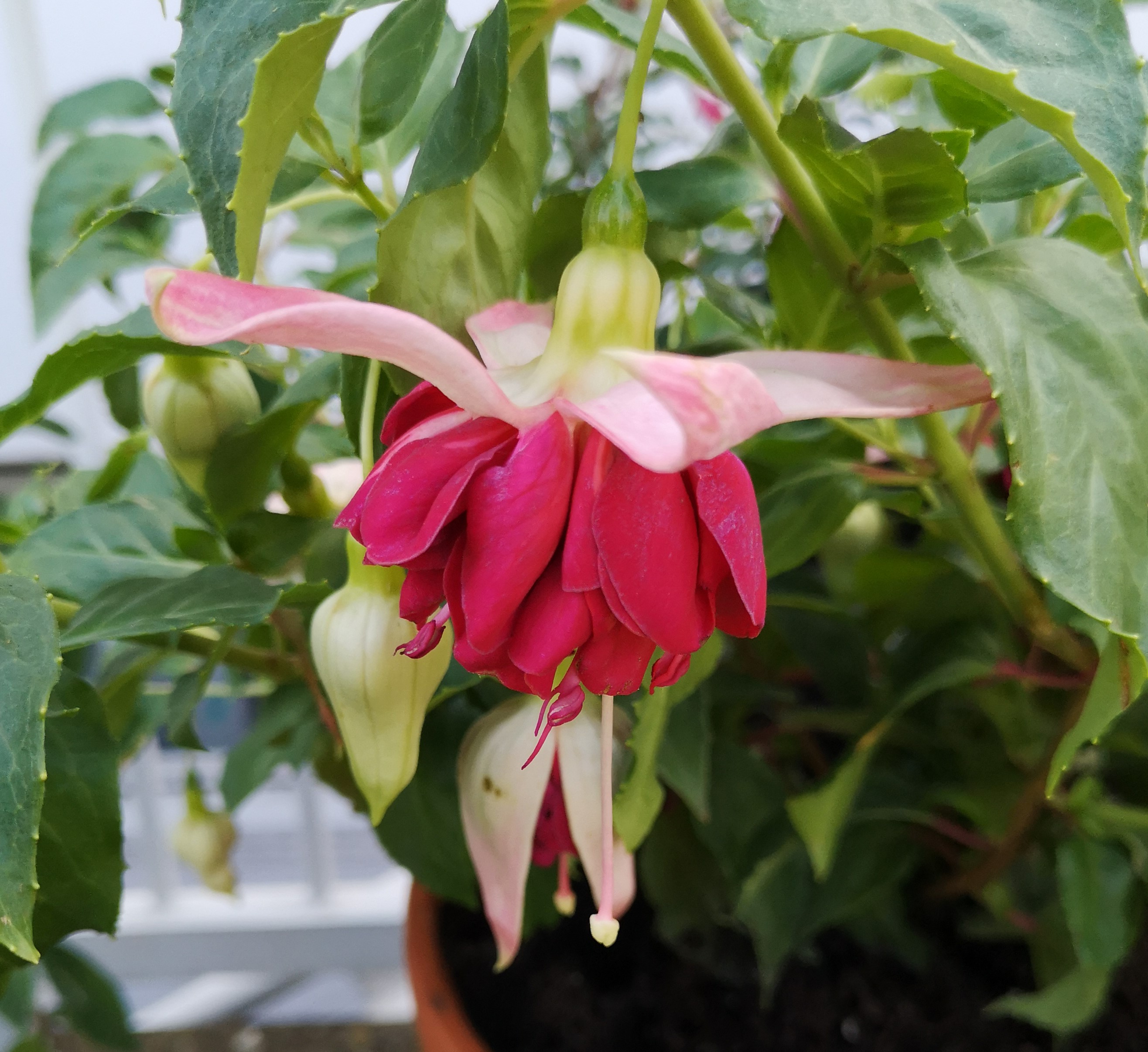 Tubus und Sepalen sind in einem schönen Weiß, Korolle/Petalen sind in einem pinkrot mit leichter weißer Flammung an der Basis.
