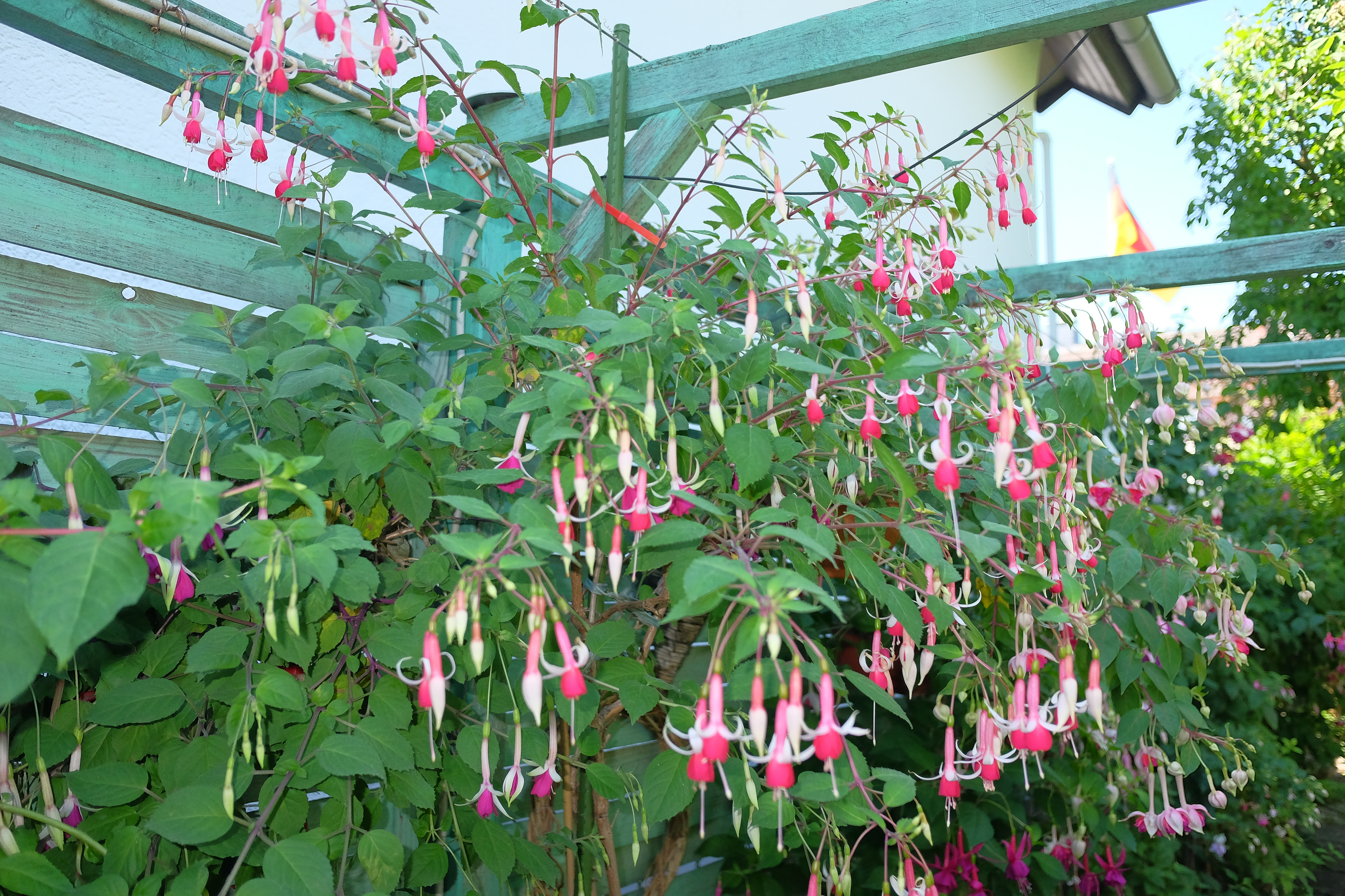 In dem Garten sind wirklich richtige Prachtexemplare. Nicht zu vergleichen mit meinen Pflanzen die in meinem Garten sind. Fuchsien für die man eine Leiter braucht um sie auszuputzen. Es gab zwei Seiten im Garten, wo die einen Fuchsien schön frisch aussahen und die anderen die das Pech hatten in der pralle Sonne zu stehen. Aber auch das kennen wir alle leider nur zu gut.