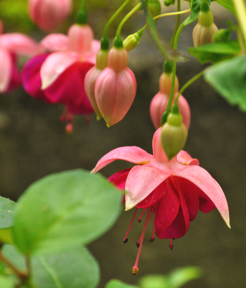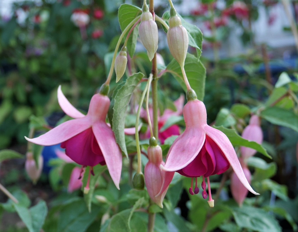 Die Blüten hängen an langen Blütenstielen. Die Farbe der Blüte ist ein frisches pink rot.