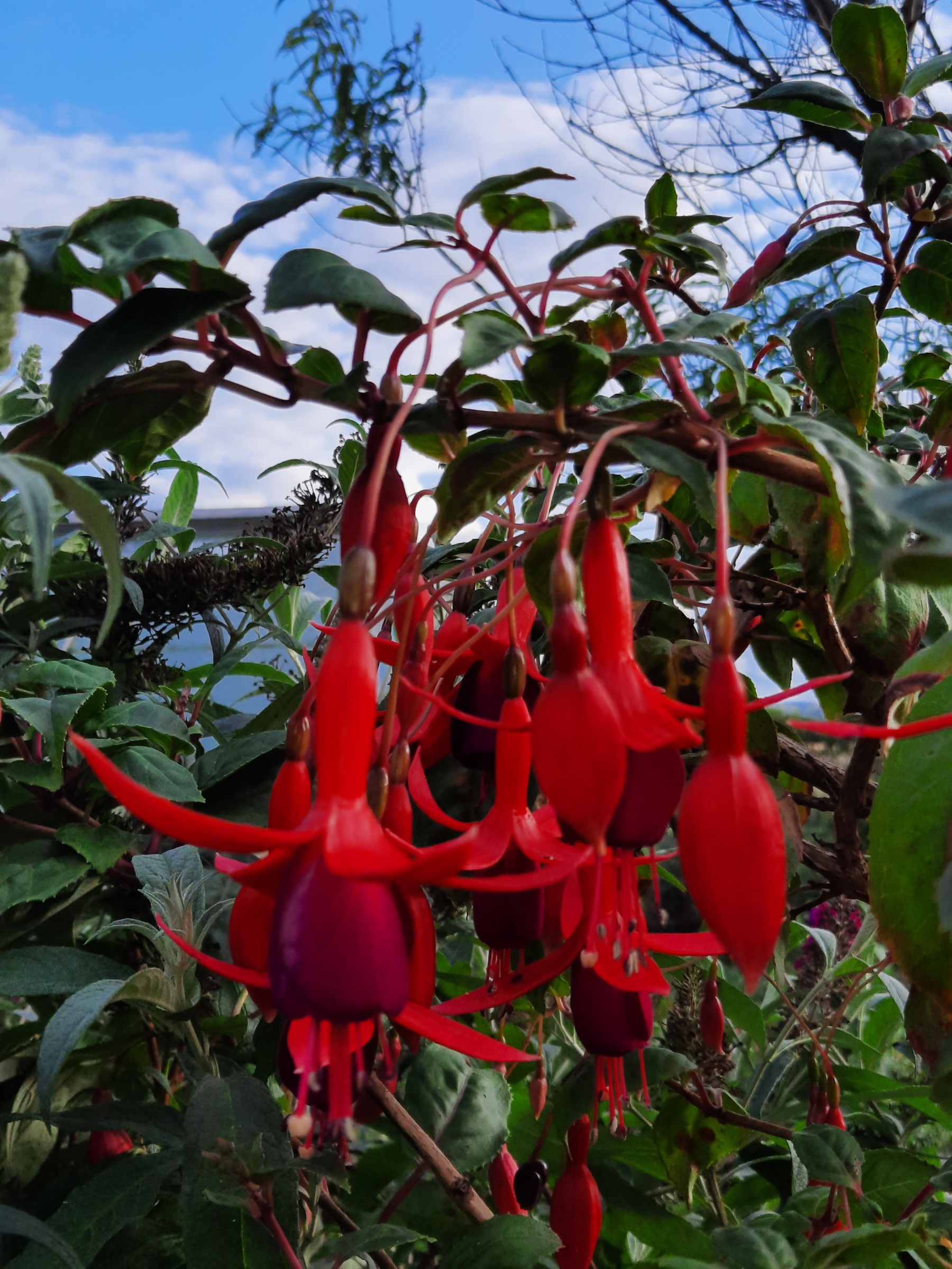 Ich mag diese Riesenfuchsie einfach. Sie ist problemlos in der Kultur, sehr starkwüchsig und ein unermüdlicher Blüher . Nach den heißen Sommertagen legt sie nochmal richtig los mit Blühen. Man kann sehr schnell einen Baum daraus ziehen, weil sie sehr schnell wächst. Das Laub ist nicht anfällig für Rost , da es sehr fest ist. Stecklinge bewurzeln gut und Überwinterung macht auch keine Probleme. Die einfachen kräftigroten Blüten sind sehr groß und leuchten regelrecht in der Sonne.
