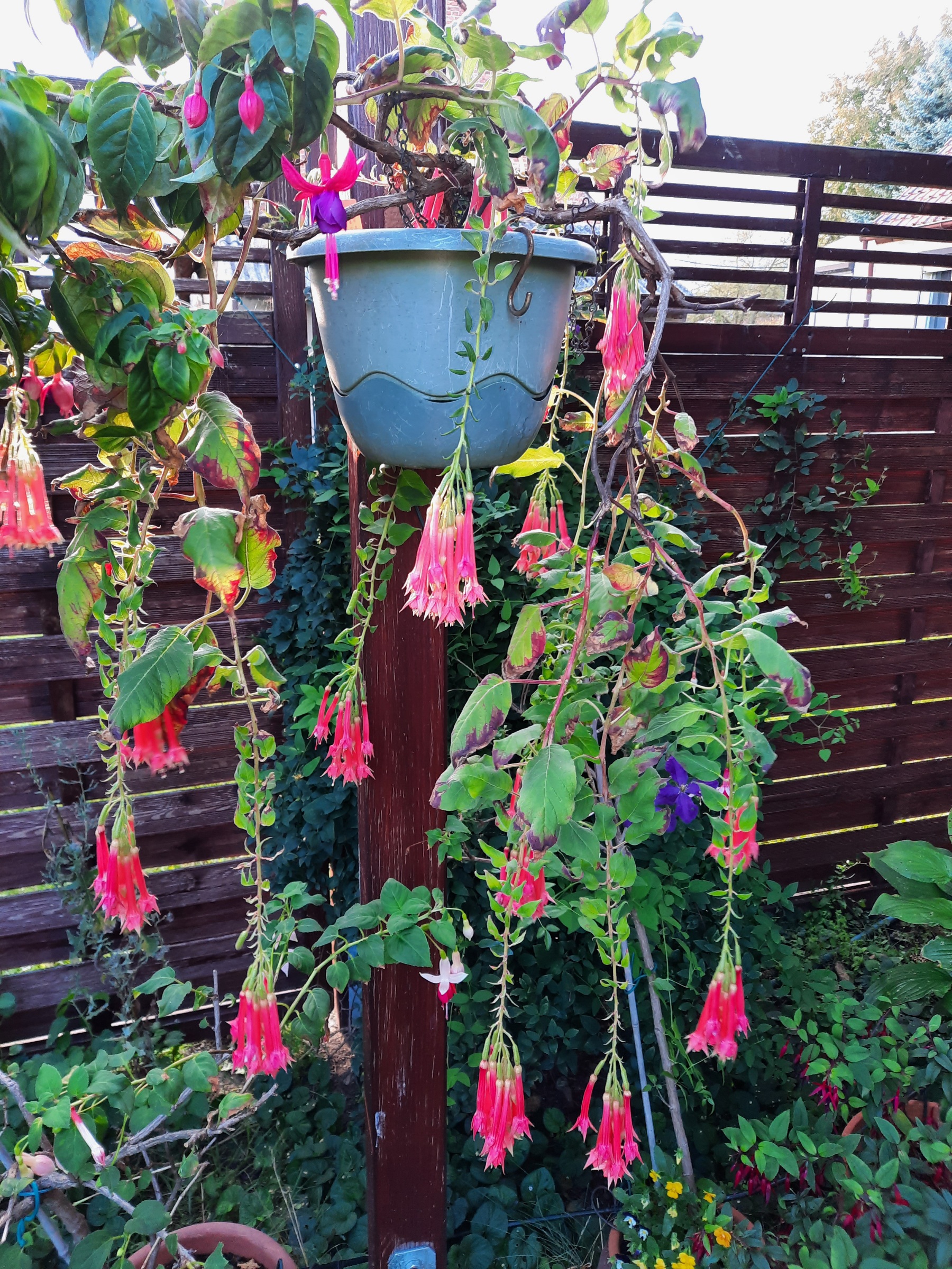 Die `Lange Anna` wurde 2009 getauft. Ich habe sie seit 2019 in meinem Besitz. Da sie etwas besonders ist, habe ich im Winter immer ein Auge drauf geworfen. Im letzten Winter habe ich sie im Gewächshaus überwintert. Ich musste sie im Herbst umtopfen , weil leider der Topf voll Wurzelläuse war. Ich habe die Erde ausgetauscht und die Wurzeln kräftig gekürzt. Es hat ihr nichts ausgemacht und blüht schon den ganzen Sommer. Etwas eigenwillig ist der Wuchs schon, aber ich finde sie trotzdem schön, aber das ist eben auch Geschmacksache. Gekauft habe ich sie damals in der Gärtnerei Bechtel, sie war mit Riesenwuchs dort bezeichnet worden und war die Herausforderung für mich. Ich mag groß werdende Fuchsien. Einen schönen Sonntag wünscht Euch Gudrun