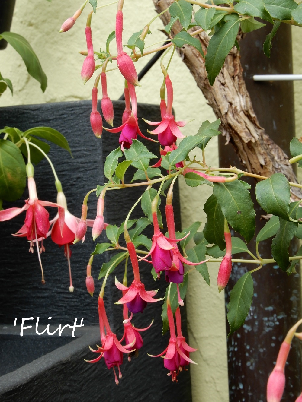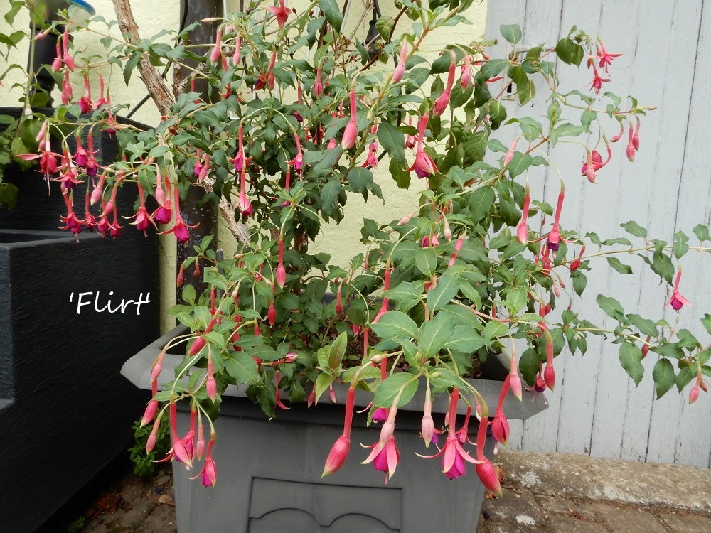 'Flirt', hat einfache, lange Blüten in ansprechender Farbe. Ein Markenzeichen ist sicherlich der Hubbel im Übergang von Sepalen zu Tubus. Zudem sind die Sepalenspitzen grünlich. Die Blüte ist häufig leicht gebogen. Bei gutem Stand und guter Versorgung mit Dünger und Wasser bilden sich zahlreiche Blüten und das bis zum Frost.