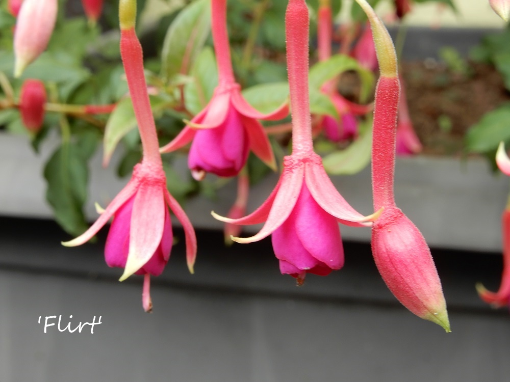 'Flirt', hat einfache, lange Blüten in ansprechender Farbe. Ein Markenzeichen ist sicherlich der Hubbel im Übergang von Sepalen zu Tubus. Zudem sind die Sepalenspitzen grünlich. Die Blüte ist häufig leicht gebogen. Bei gutem Stand und guter Versorgung mit Dünger und Wasser bilden sich zahlreiche Blüten und das bis zum Frost.