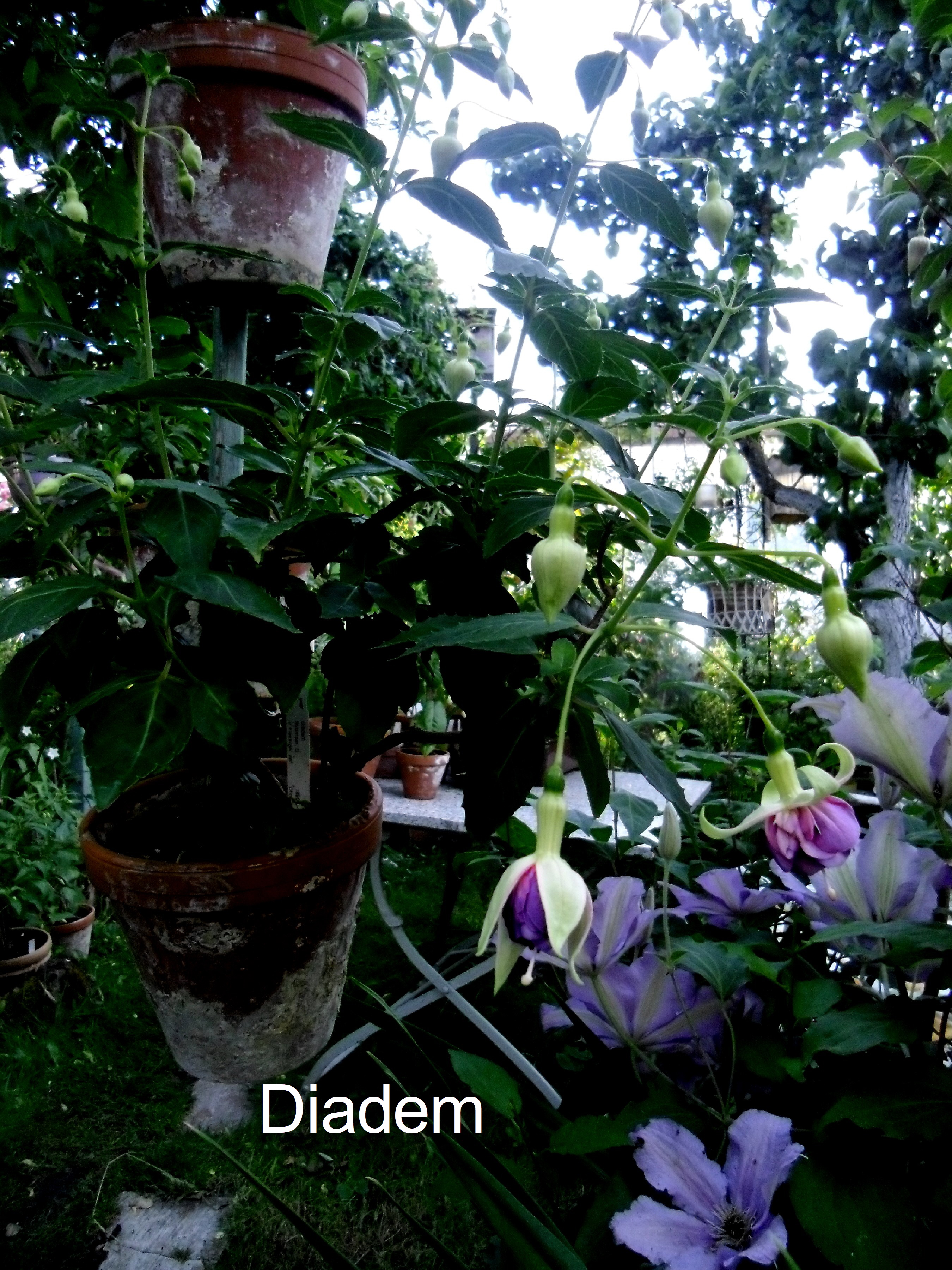 Ich habe die Diadem gleich zweimal.Einmal als Busch und einmal als Stämmchen wobei das Stämmchen ein wenig gekaspert hat .Zwei oder drei Jahre habe ich sie schon und kann sagen es ist eine tolle Fuchsie.Vor allem das Farbenspiel in der Blüte.Man denkt man hat zwei Pflanzen in einem Topf.Es ist ja bei fast allen Fuchsien im Laufe der Blütezeit ein Farbwechsel drin doch bei der Diadem ist es besonders auffällig.