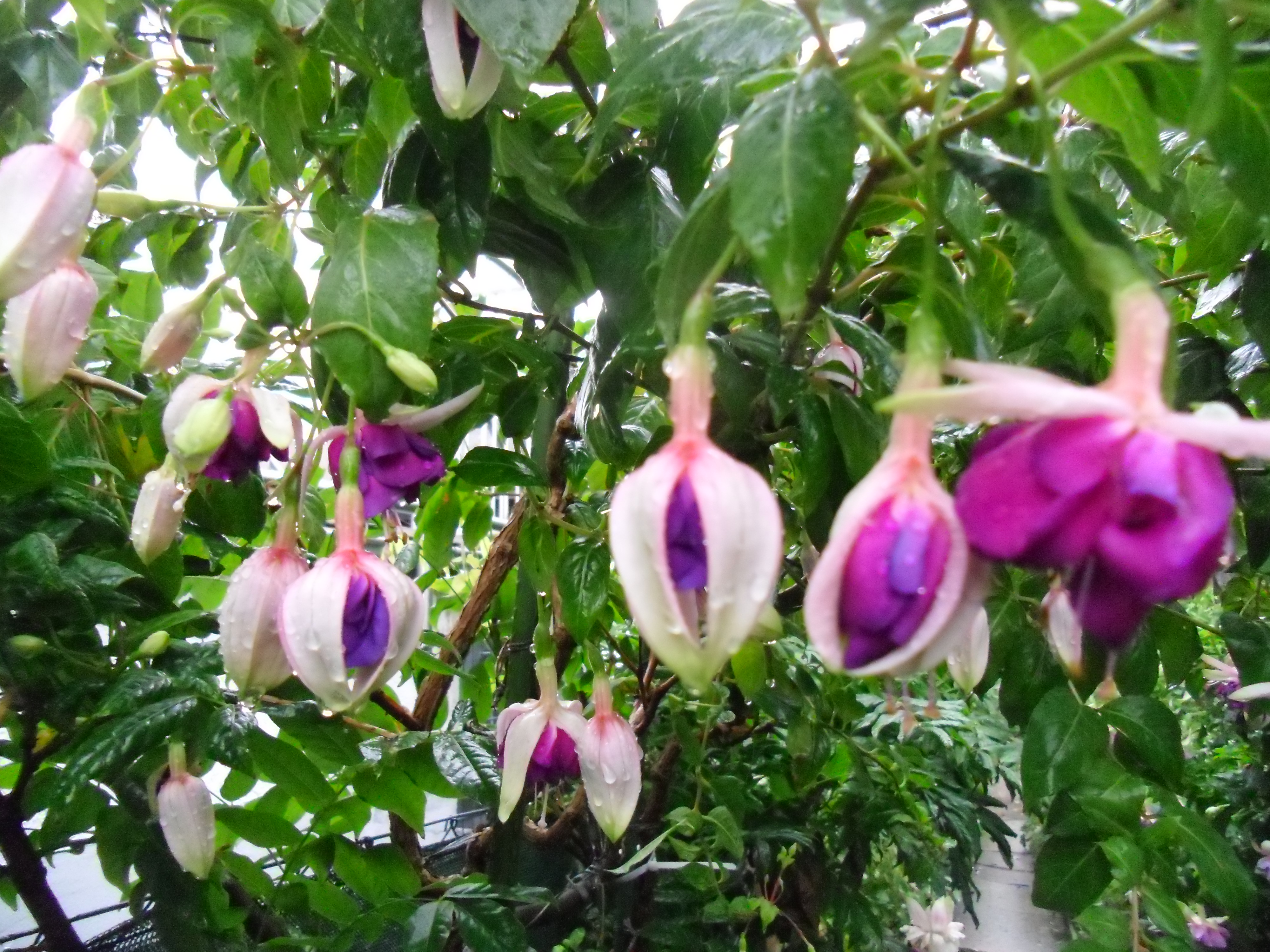 Sie hat ziemlich spät geblüht in diesem Jahr, aber jetzt fallen die Blüten erst auf. Man denkt, es sind verschiedene Pflanzen, wenn man die Blüten betrachtet. Die Fuchsie wächst halb überhängend, dann ziehen die Blüten die Zweige nach unten. Am besten zieht man sie in einer Ampel. Auffallend ist die kräftigblaue Korolle, die sich später mehr ins Rosa wandelt. Ich finde, es ist ein echter Hingucker, dem ich im nächsten Jahr mehr Aufmerksamkeit schenken werde.