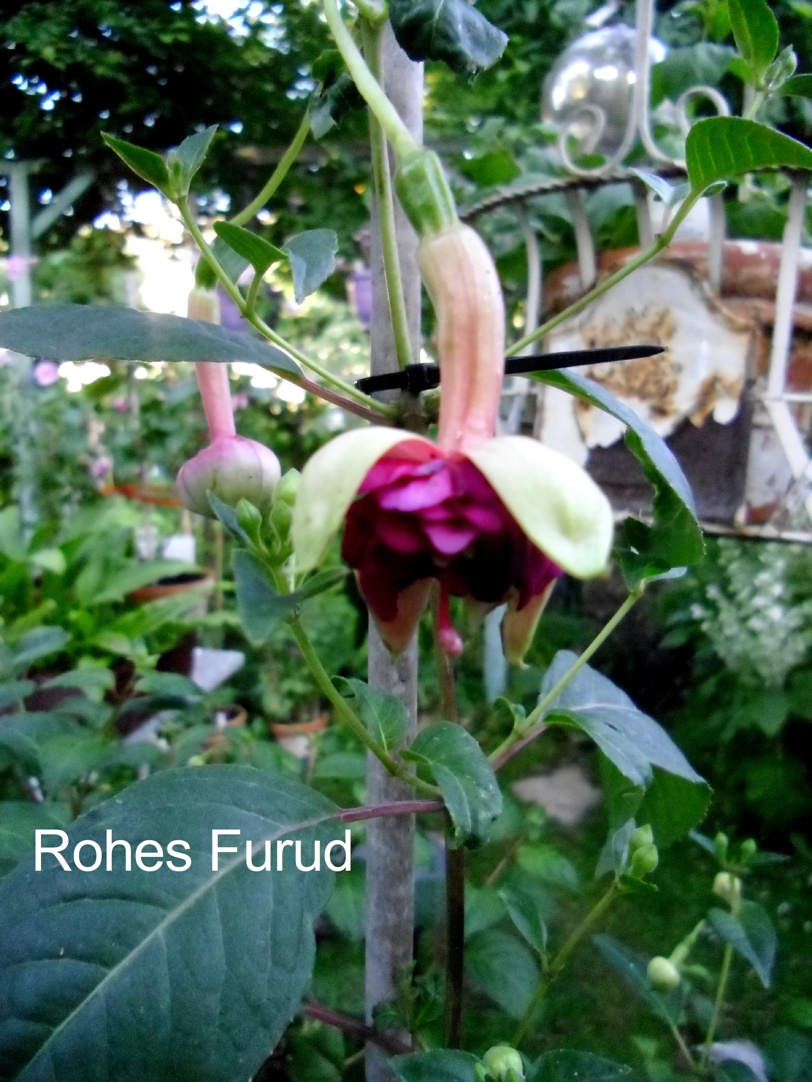 Doch zu "Rohees Furud". Die Blüte ist schon sehr besonders nicht nur durch die Länge des Tubus sondern auch die Farbgebung der Korolle. Man muß sie in Natura sehen die Bilder zeigen bei weitem nicht die ganze Schönheit. Die Korolle ist richtig kugelig rund und dick. Sie öffnet sich recht langsam und entfaltet dann ein kleines Farbfeurwerk. Ein dunkles weinrot mit blau unter crem-grünen Sepalen . Wenige Fuchsien zeigen dies in der Form.