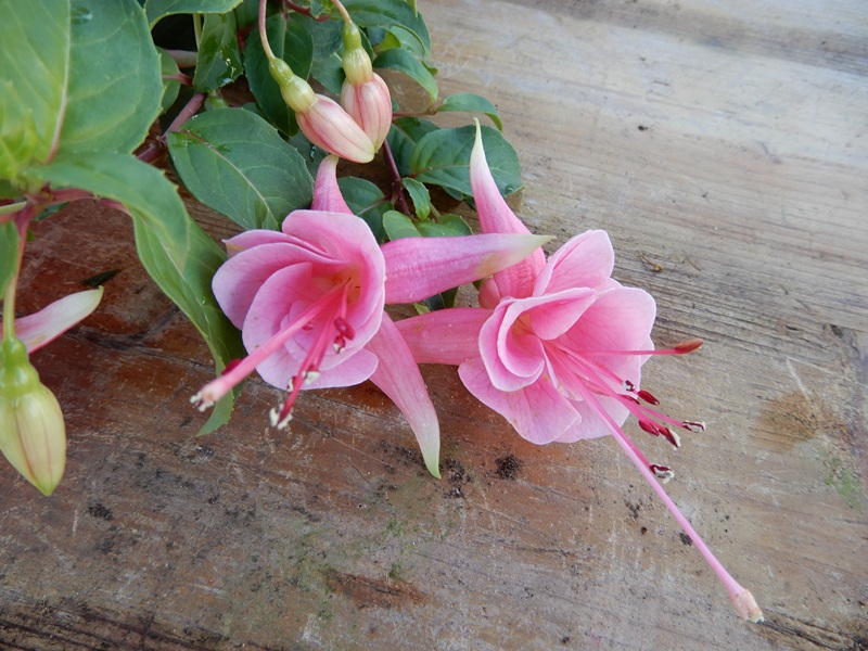 In diesem Jahr, halbschattig stehend, ist auch 'Leonora' prächtig gewachsen. Ich hatte sie zusammen mit anderen rosafarbenen Fuchsien in einem Hochbeet stehen. Sie entwickelte sich toll und blühte ohne Unterbrechung bis zum Rückschnitt.