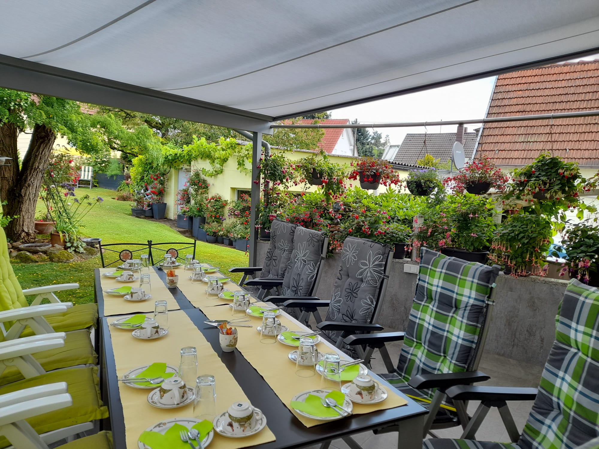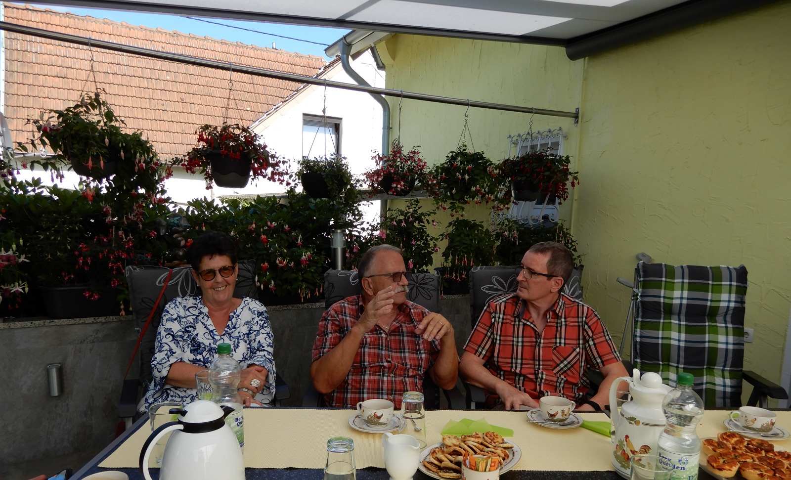 Heute ist, bei gutem Wetter, wieder ein Treffen in unserem Garten. Da die schattenspendenden Thujas nicht mehr da sind, müssen wir auf der Terrasse Platz nehmen. Bisschen beengt, aber wir Saarländer kuscheln gerne