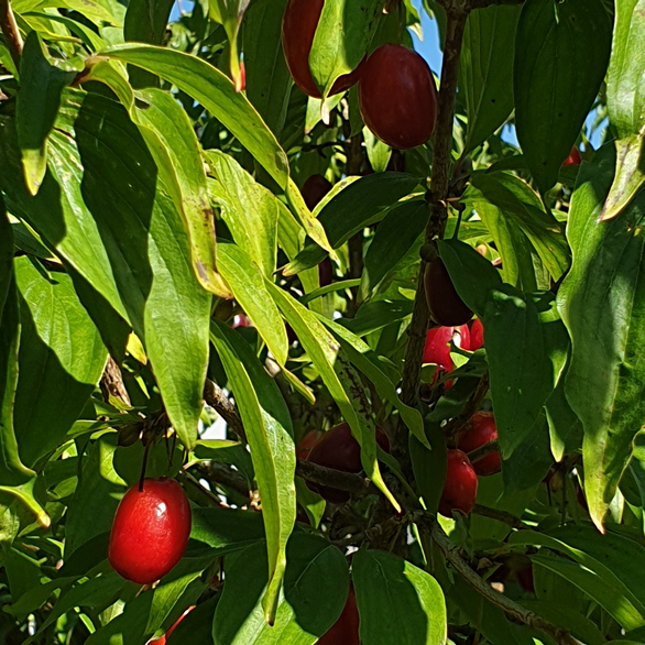 weiter entlang der Straße steht eine Kornelkirsche .. Diese werden mit Sauerkirschen zu Marmelade verarbeitet ... In der Ecke ein Sanddorn ... er wird bald geerntet :-)