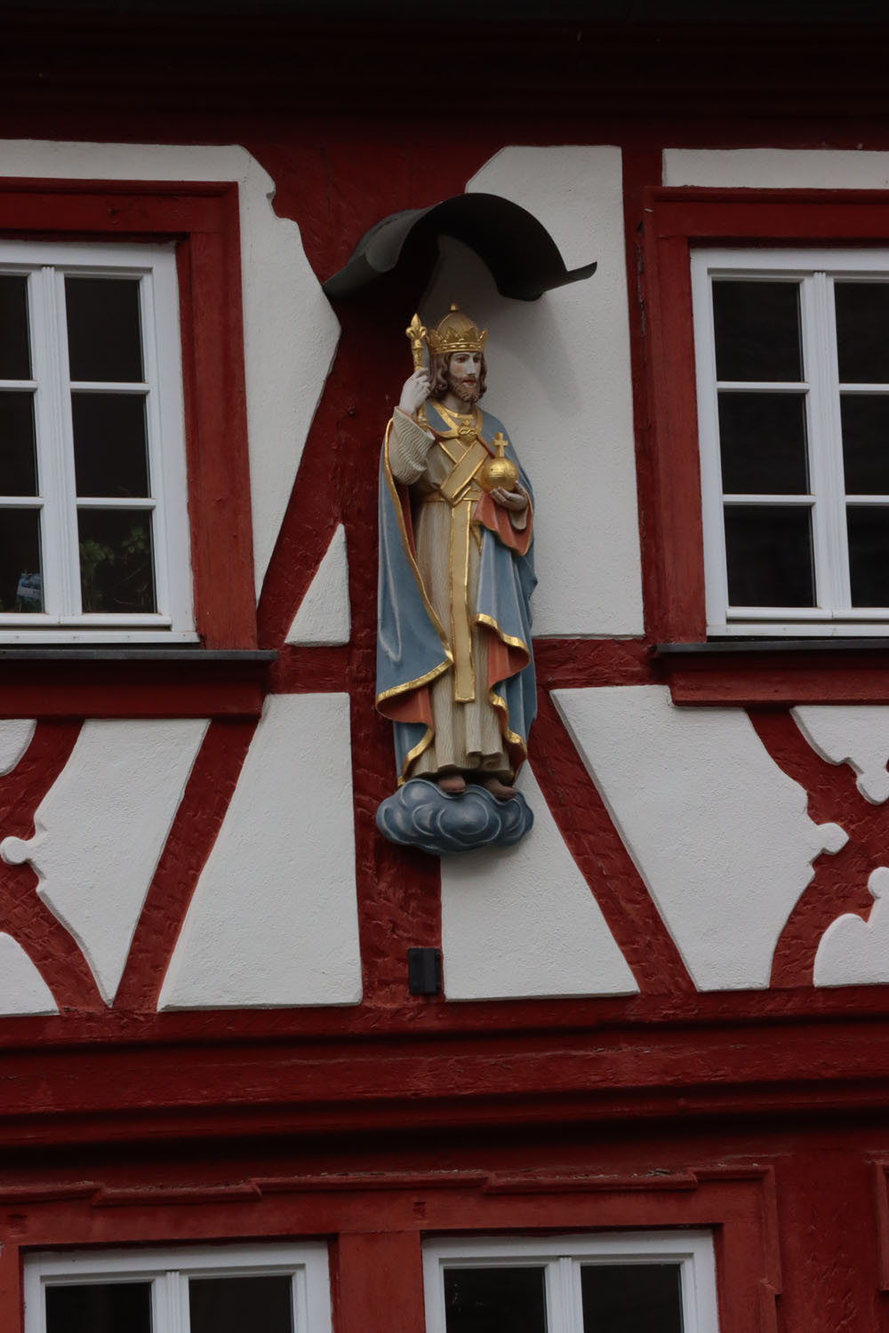 An der Hauptstraße hing an fast jedem Haus eine Statue an der Fassade.